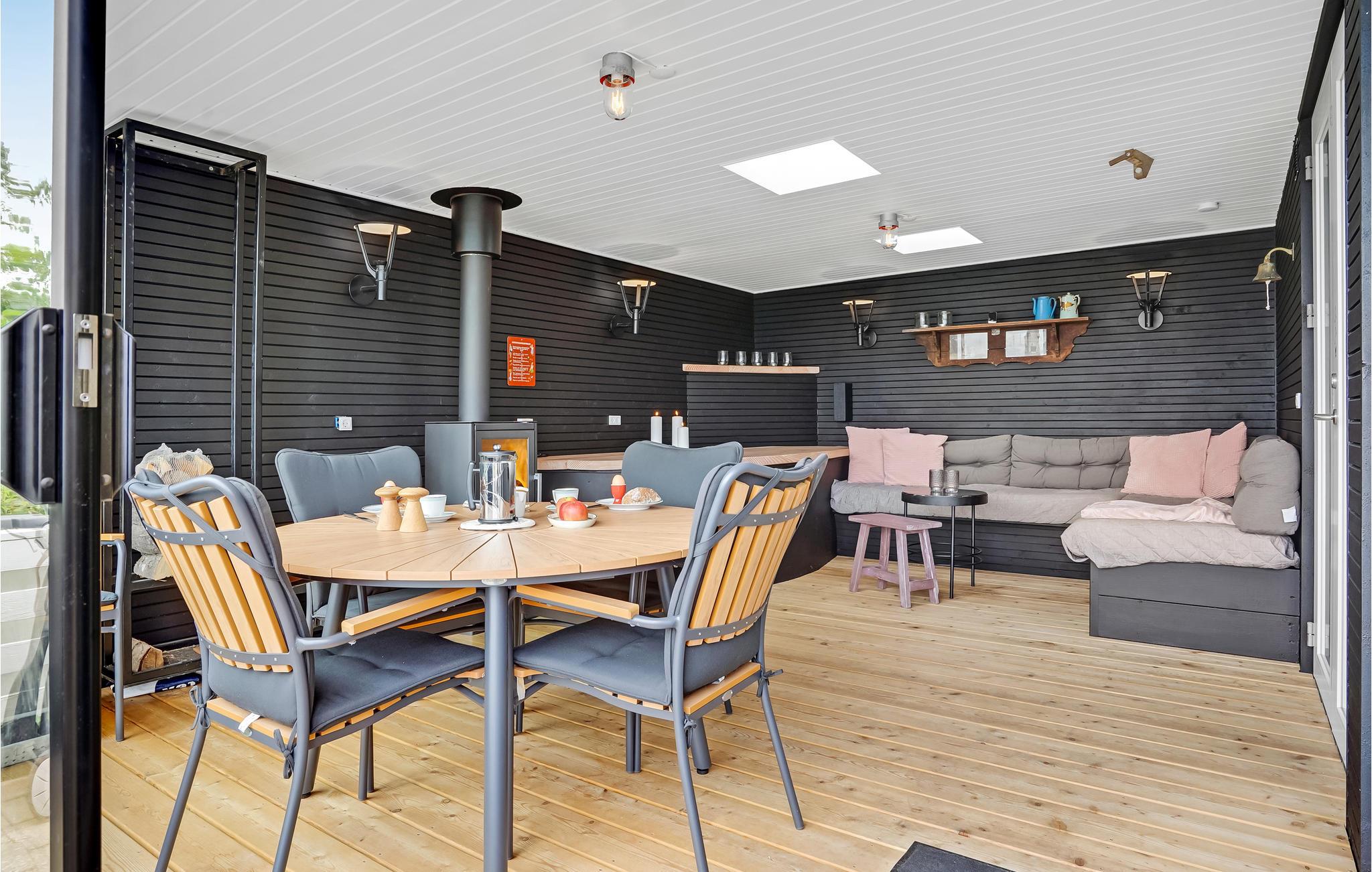 Envidere har I en flot overdækket terrasse med skydedøre i termoglas til rådighed. Terrassen bliver hurtig en naturlig del af opholdet i huset og er bla. indrettet med to sovepladser, således at man kan sove her, hvis man ønsker sig en nat ude. Husets brændeovn er også installeret her. Det er virkeligt en oplevelse.