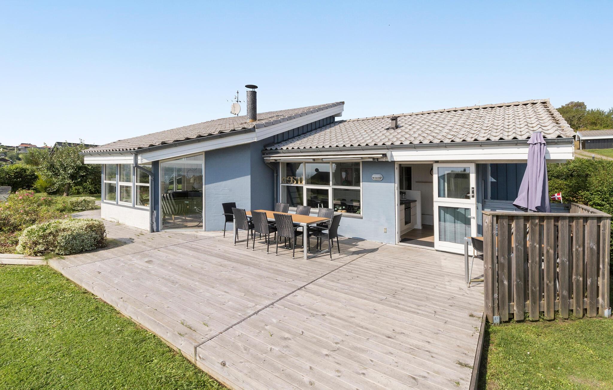 Hyggeligt sommerhus nær Egsmark Strand med havudsigt, spabad og stor terrasse til afslapning og leg.