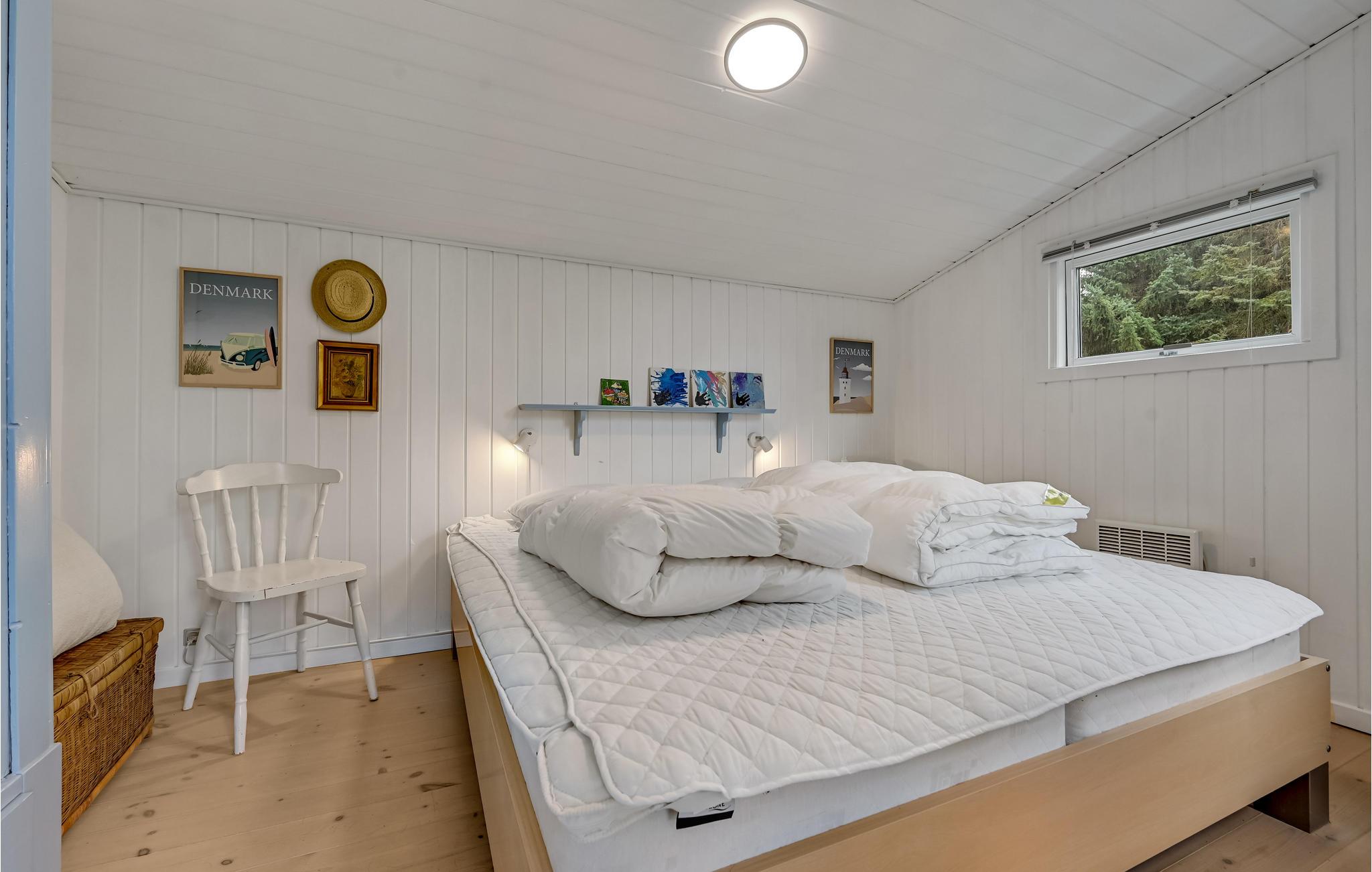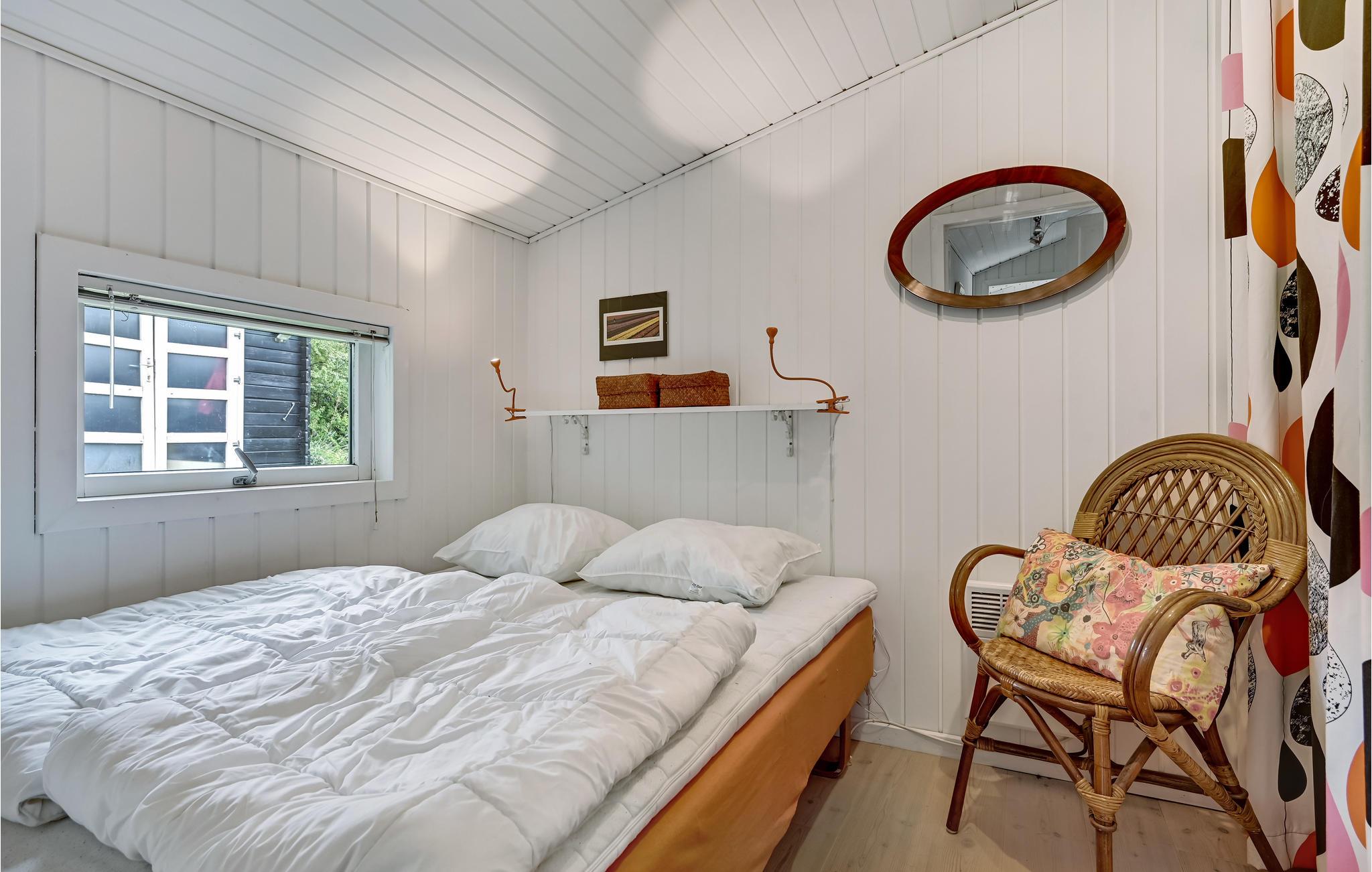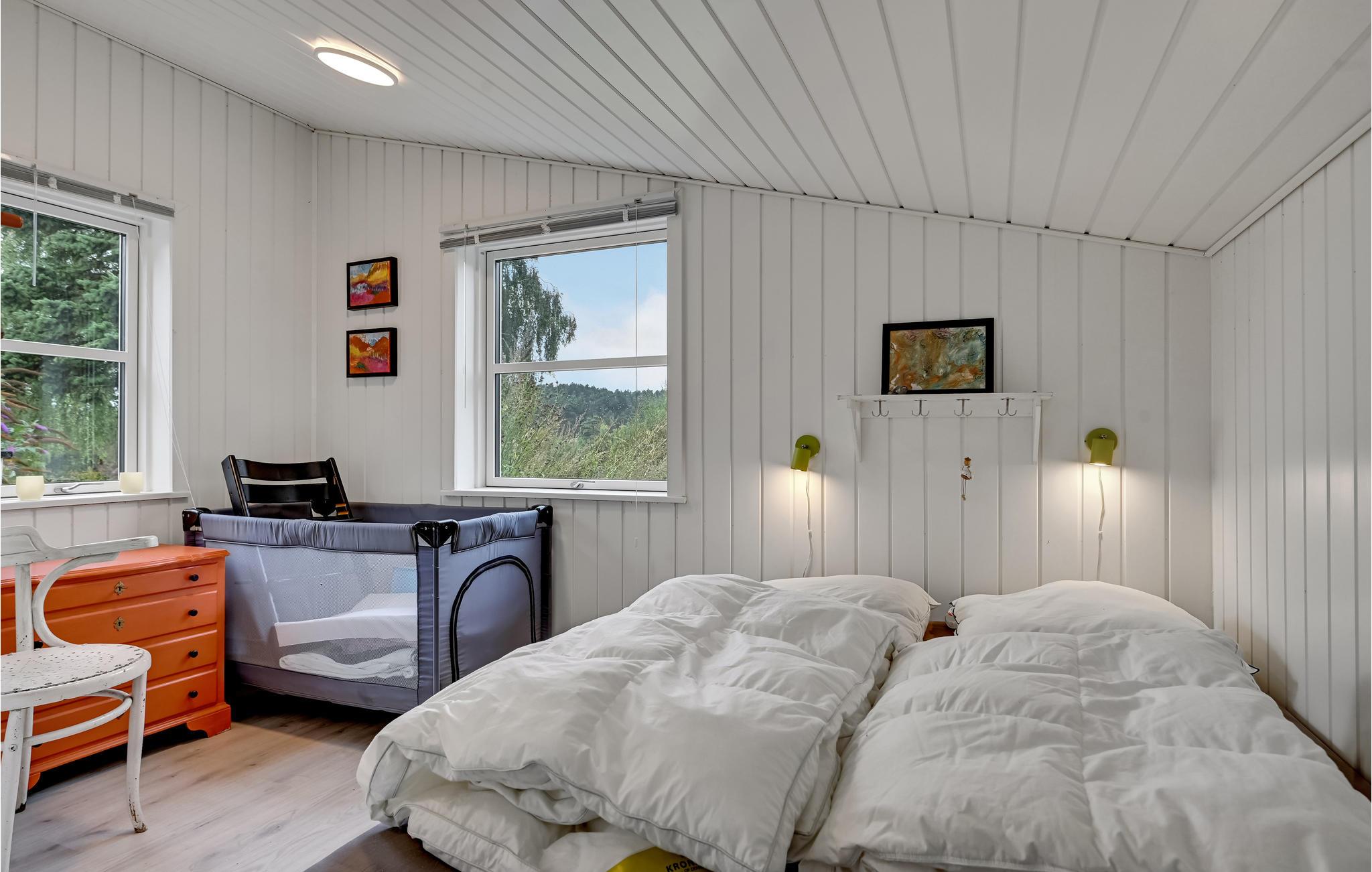 Sommerhuset har 3 soveværelser med plads til i alt 6 personer, det ene af dem har udover dobbeltseng også en babyseng.