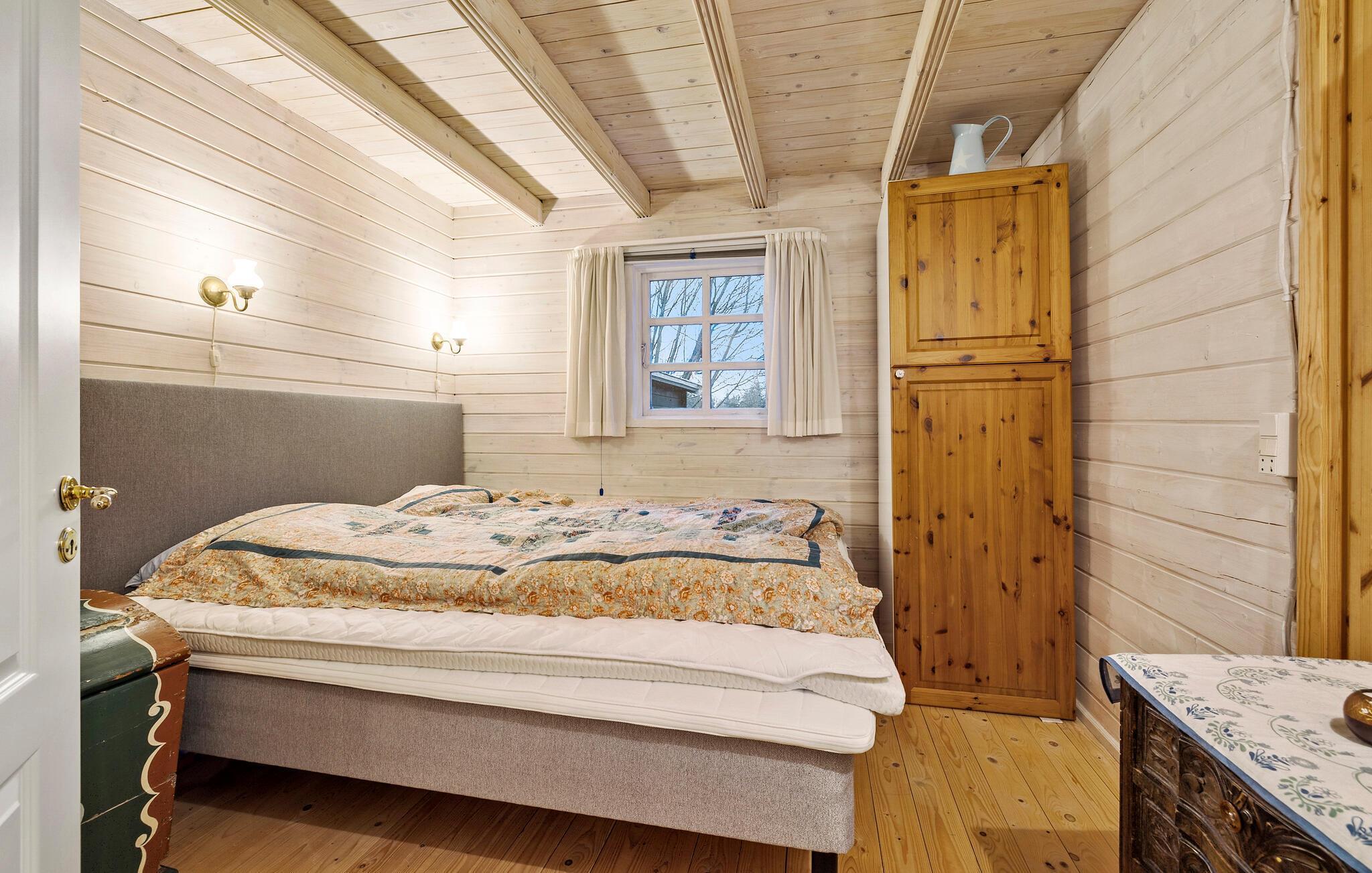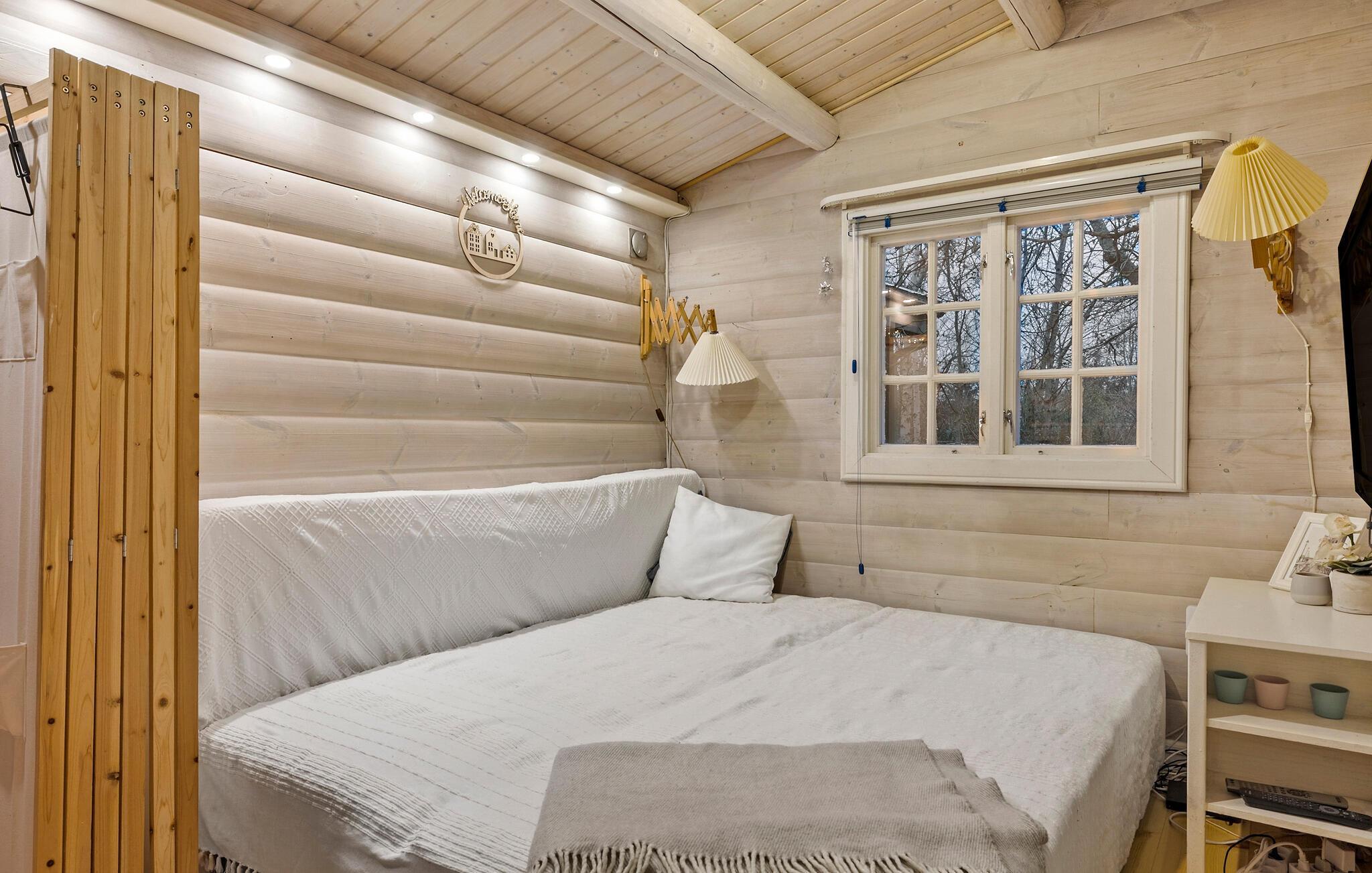 Charmerende bjælkehytte med stor have ved strand