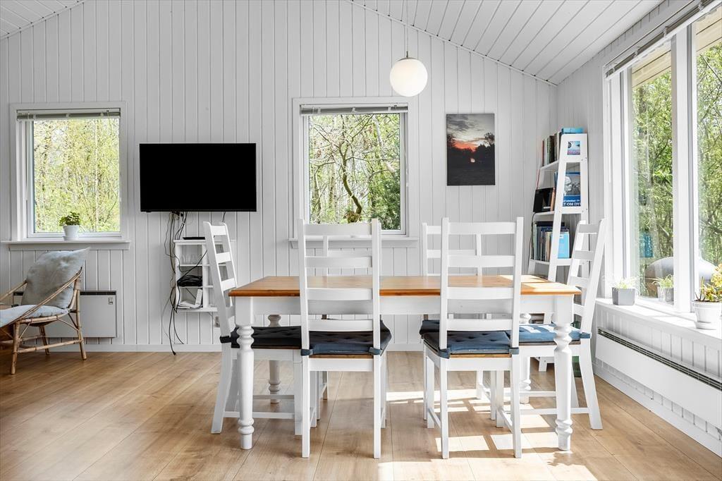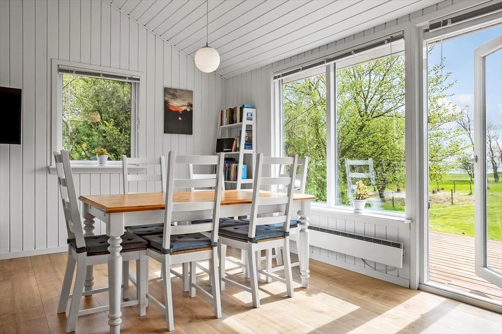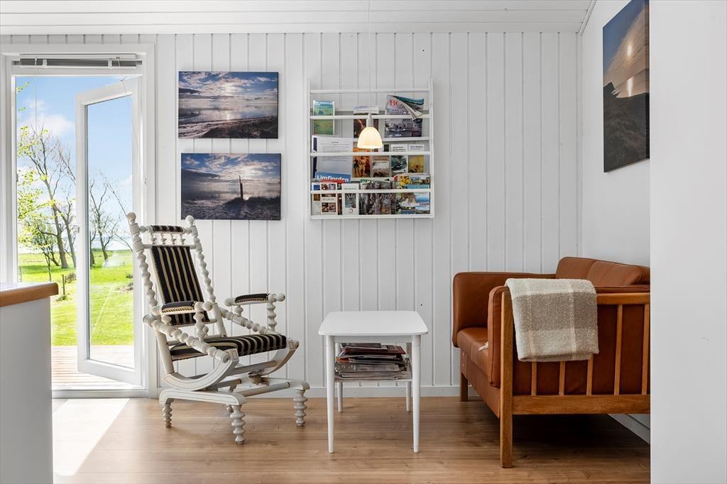 I kommer til at bo i første række til vandet, når I holder ferie i dette dejlige sommerhus i Ejerslev Lyng på Nordmors. Fra stuen og det åbne køkken kan I nyde udsigten til Limfjordens blå bølger, og I har det samme smukke vue, når I soler jer på terrassen eller spiller bold på græsplænen.