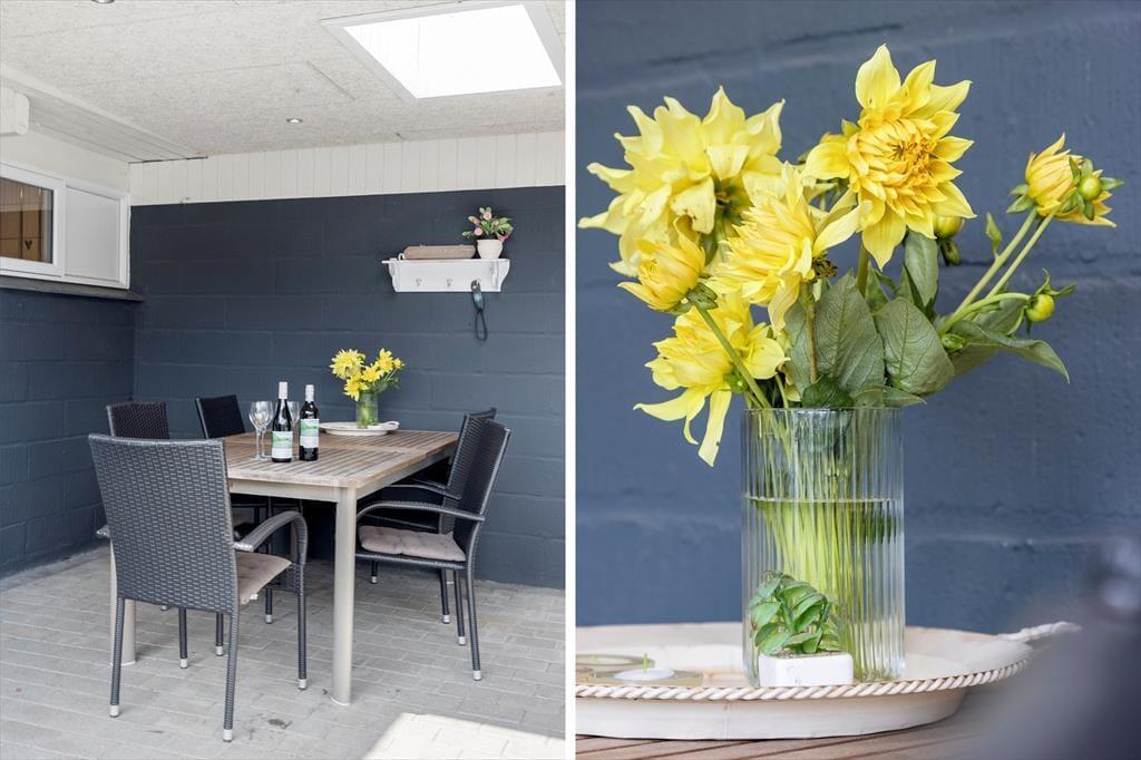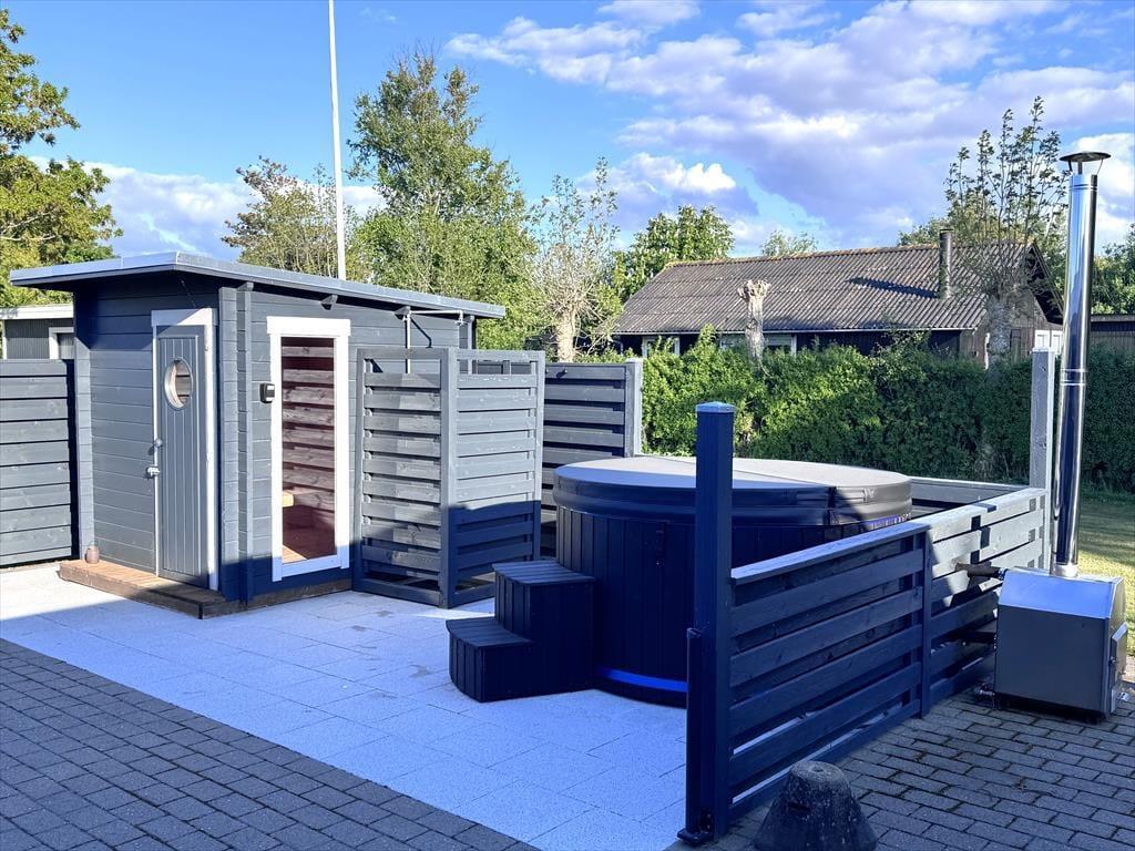 Den grønne havegrund fremstår lige så pæn og velholdt som selve sommerhuset, og der er flere dejlige detaljer at hæfte sig ved. For eksempel er en del af terrassemiljøet anlagt som en rigtig wellness-afdeling med stor sauna og en udendørs bruser, og sidstnævnte kan både bruges som opkvikker om morgenen og senere på dagen, hvis du vil vaske saltvand af efter strandturen eller have en skyller efter solbadning. Den velordnede græsplæne er et perfekt underlagt, hvis du vil dyste i kongespil mod familien, og både på de åbne terrassearealer og det overdækkede område er der skønt at sidde, når det er til at slappe helt af.
