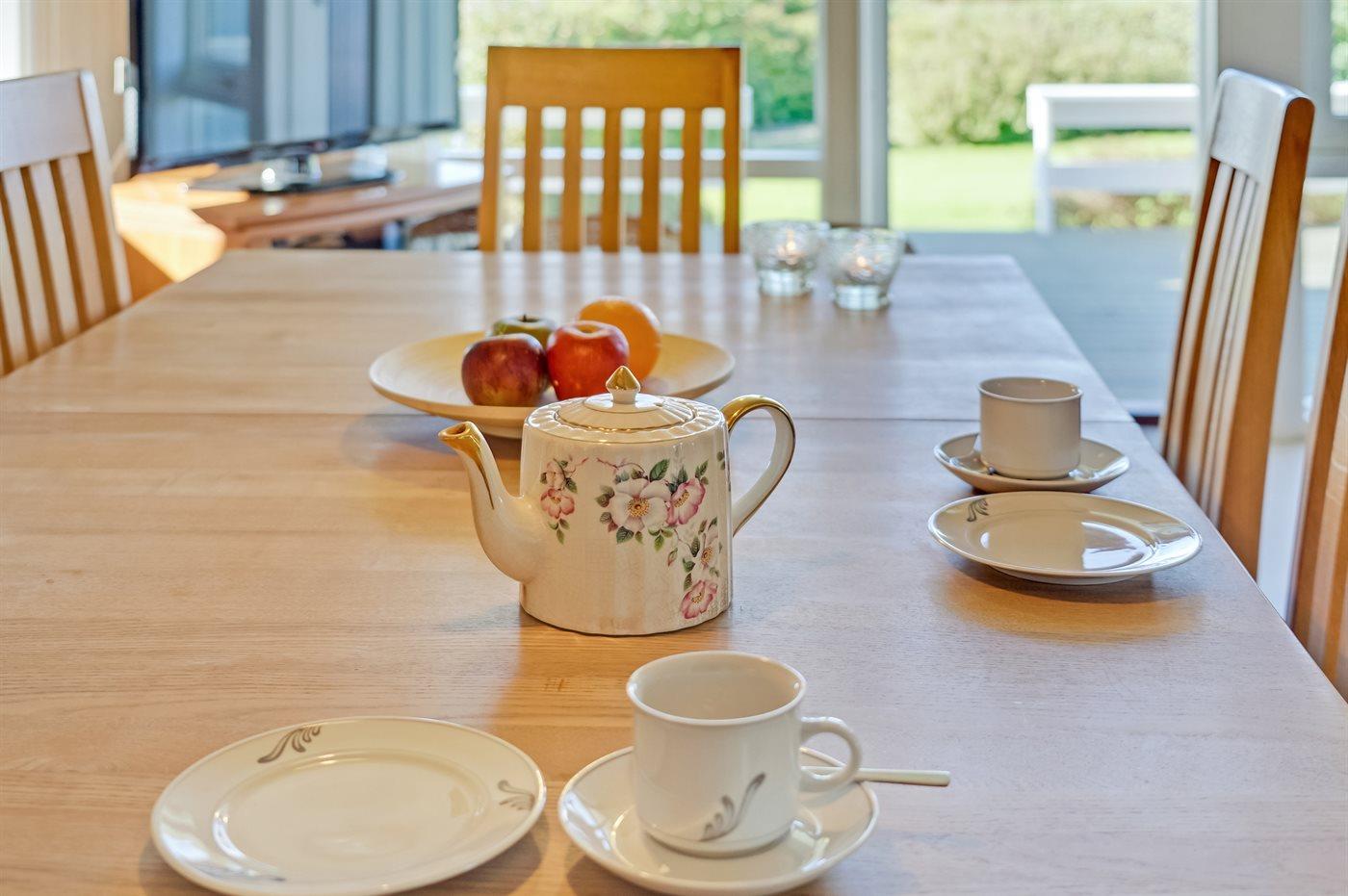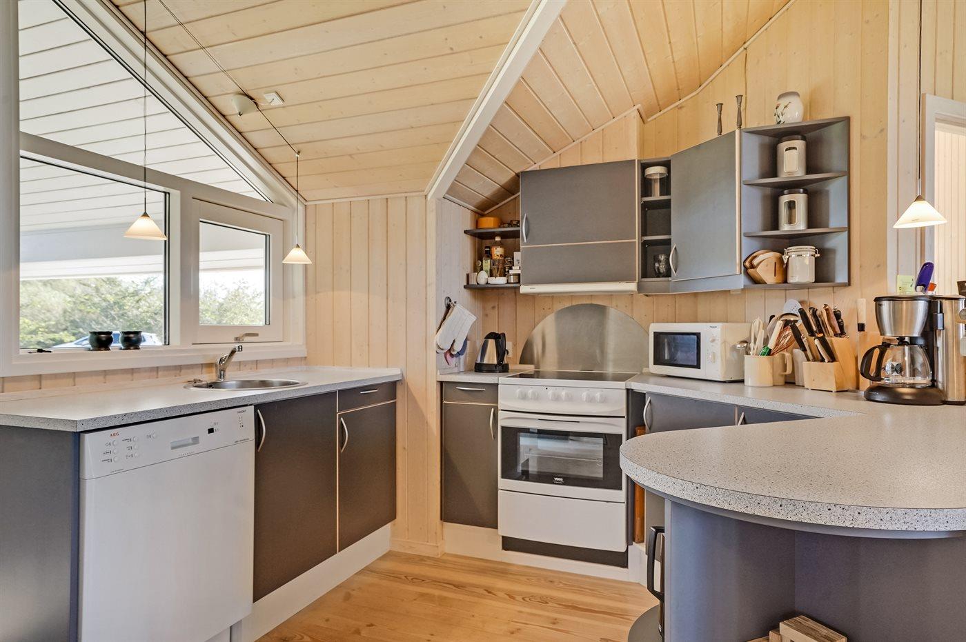 Køkkenet er udstyret med 1 køleskab. Der er 4 keramiske kogeplader, varmluftovn, mikrobølgeovn samt opvaskemaskine.