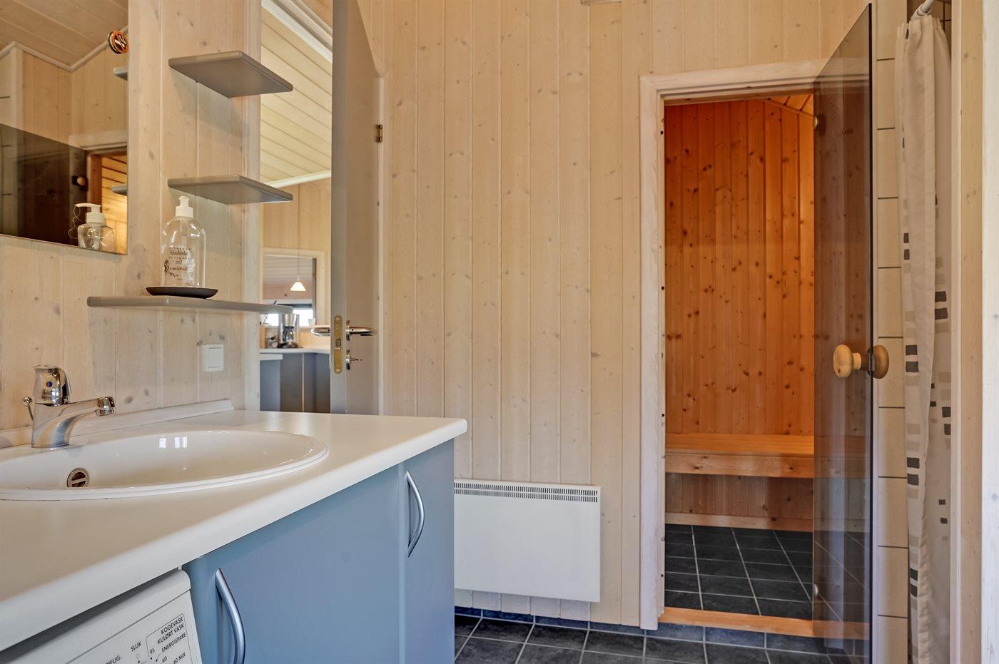 Der er 2 badeværelser med bruseniche og 2 toiletter. Der er gulvvarme på 2 badeværelser. I saunaen er der mulighed for afslapning.