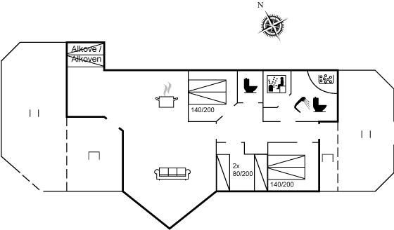 Der er i alt 3 soveværelser. Sovepladserne fordeler sig på: 4 sovepladser i dobbeltsenge. 2 sovepladser i enkeltsenge. 2 sovepladser i alkove. Derudover er der 1 stk. barneseng.