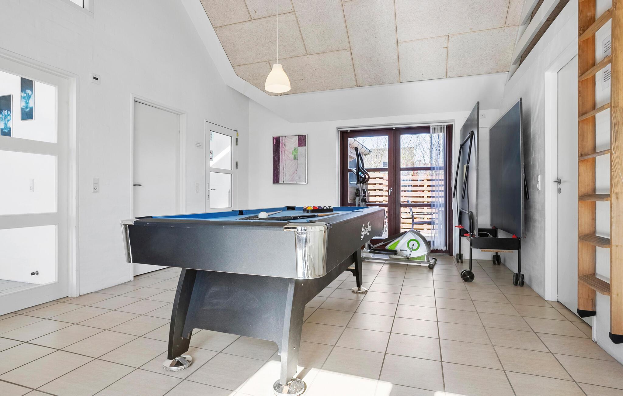Dejligt swimmingpoolhus, hvor der absolut er tænkt på alle detaljer. Huset er indrettet med alle former for moderne aktiviteter bl.a. billard, beachvolley, playstation, internet m.m, så her kommer man aldrig til at kede sig. Den store poolafdeling byder ligeledes på masser af aktiviteter i det våde element. Samtidig er huset udstyret med varmepumpe, så i forhold til mange andre swimmingpoolhuse er energiomkostningerne lavere med fordel for både miljø og gæster. Huset ligger i det rolige ferieområde Ejsingholm, hvor der kun er få minutters gang til vandet. Stranden ved fjorden er børnevenlig med lavt vand og her er desuden gode betingelser for sejlsport.