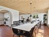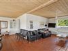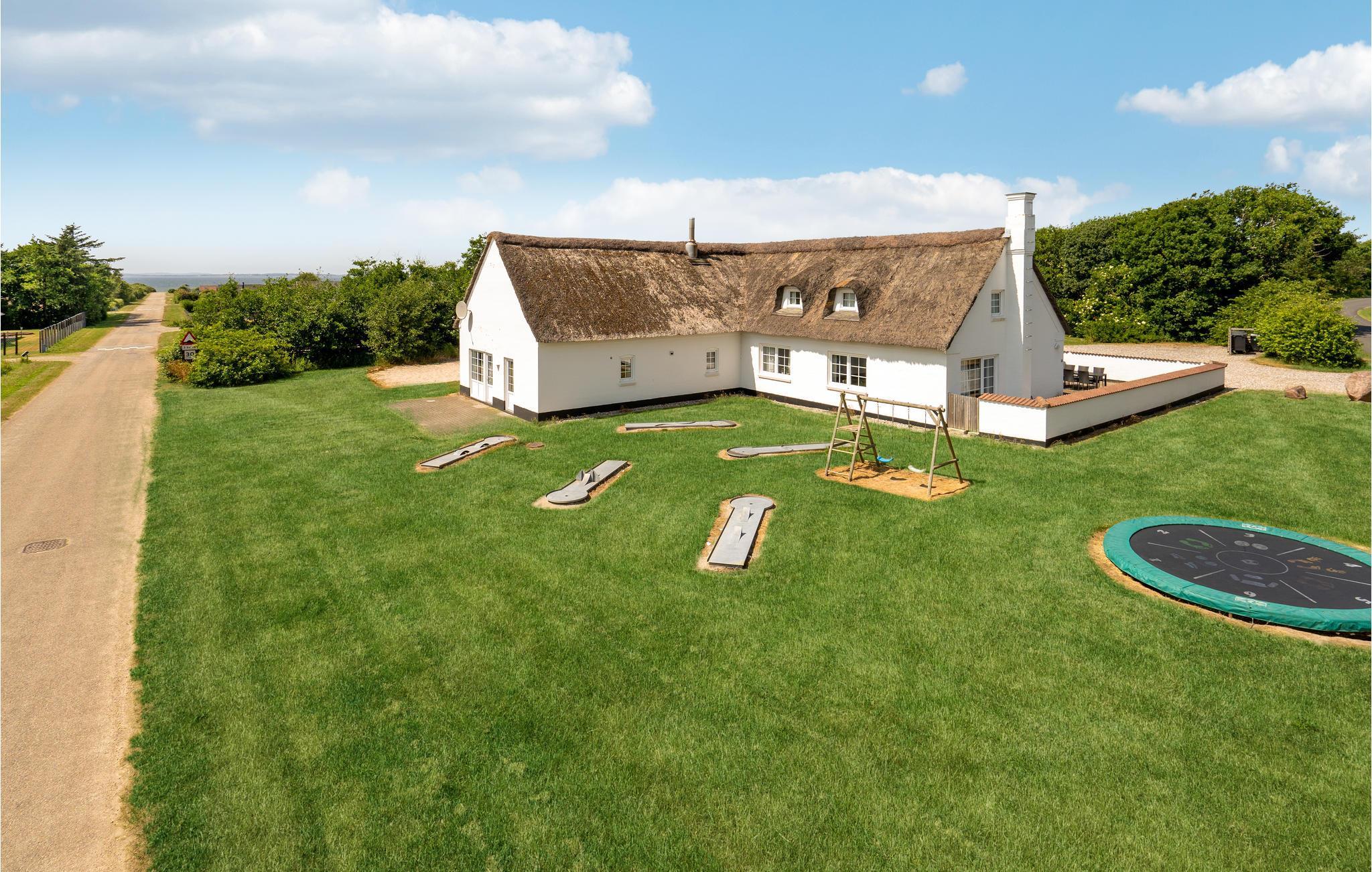 Dette meget rummelige stråtækte hus i to etager med pool, sauna og spabad, aktivitetsrum og havelegeplads i et roligt boligområde tilbyder plads til den helt store familiesammenkomst eller flere vennefamilier. Feriehuset er meget veludstyret og moderne indrettet. Nyd en skøn tid med fælles madlavning, spillehygge, sjov i det private indendørs badeland med palmer, rutsjebane og jacuzzi, selvforkælelse i saunaen og lækre måltider for hele gruppen ved det kilometerlange bord i henholdsvis spisestuen og på terrassen. Mens de udvalgte kokke laver mad, kan børnene gynge og hoppe til svimlende højder på trampolinen. Nyd dejlige måltider på terrassen med vidunderlig sommerstemning og et glas vin eller en cocktail under åben himmel, når børnene er lagt i seng.. Det store højdepunkt er og bliver dog nok den private minigolfbane med 5 huller. Grib strandtasken og tilbring mange timer på sandstranden ved fjorden. Om aftenen kan I nyde skønne gåture langs vandet i solnedgangens skær.