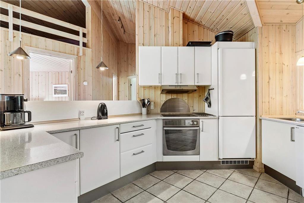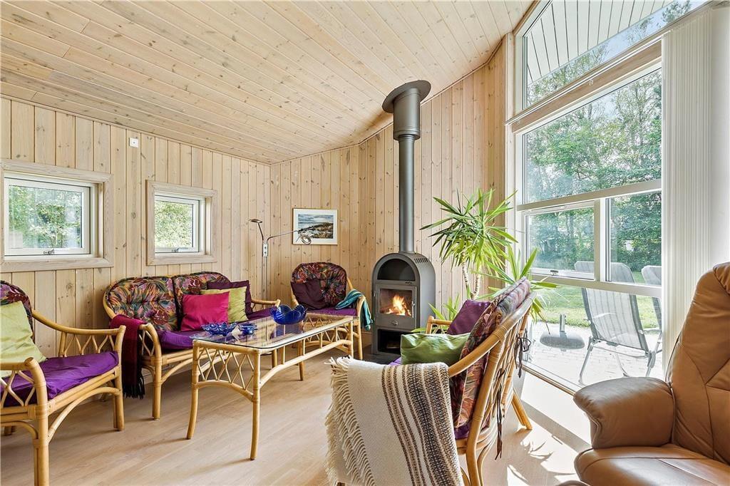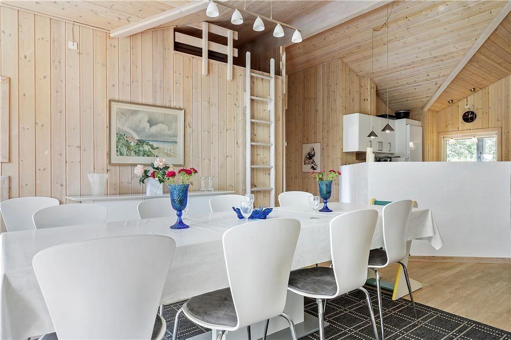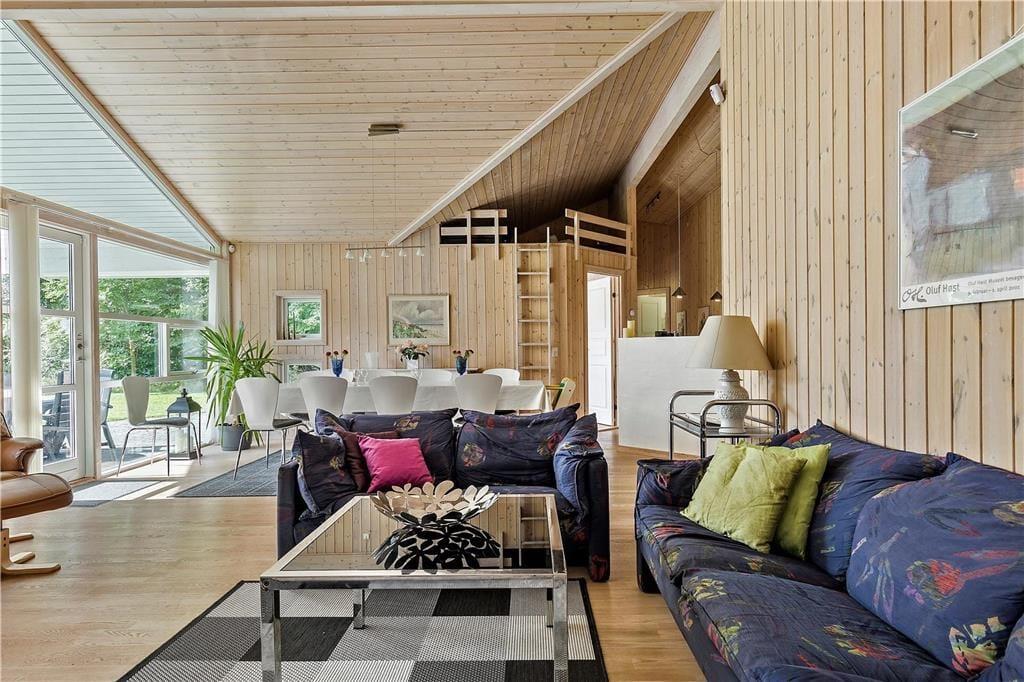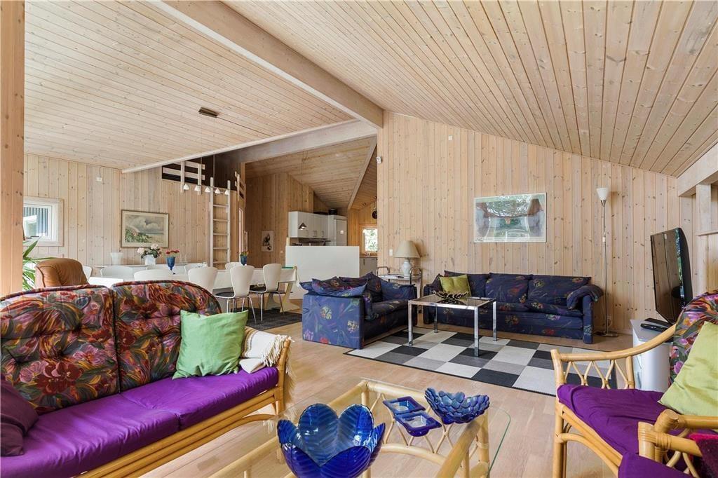 Den lyse stue er åben med loft til kip og kik til haven fra de store vinduer mod terrassen. Omkring det store langbord er der god plads til jer alle, og spisebordet er placeret lige ved siden af det åbne køkken, så I fælles kan dække bordet med lækkerier. Med hele to sofagrupper giver det mulighed for både at finde ro til at strikke eller læse en bog, samtidig med at andre spiller kort eller brætspil. Hvad bliver din favoritplads? Hvad enten i er flere familier, vennepar eller 2 generationer der er afsted, vil du føle dig godt tilpas her. Bemærk, der er stejl adgang til hemsen.