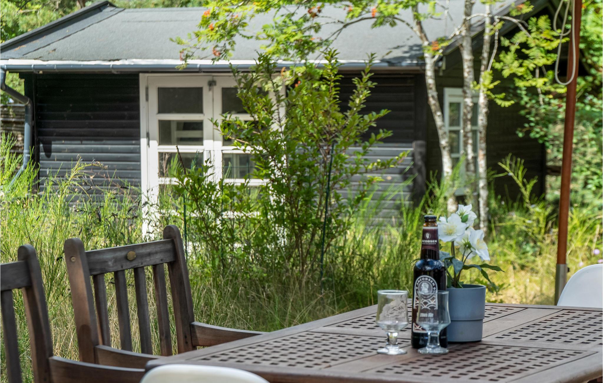 Lyst, familievenligt sommerhus med brændeovn, udendørs pejs og stor naturgrund.