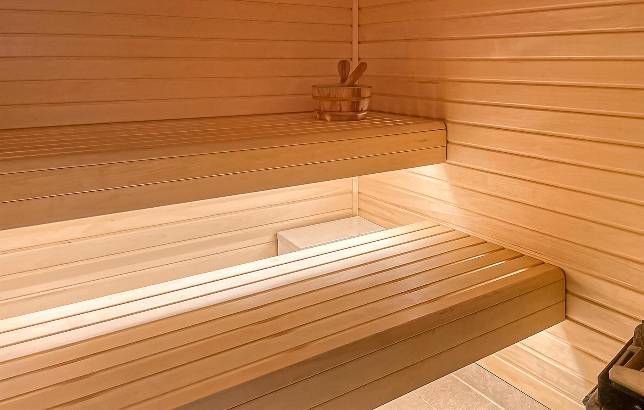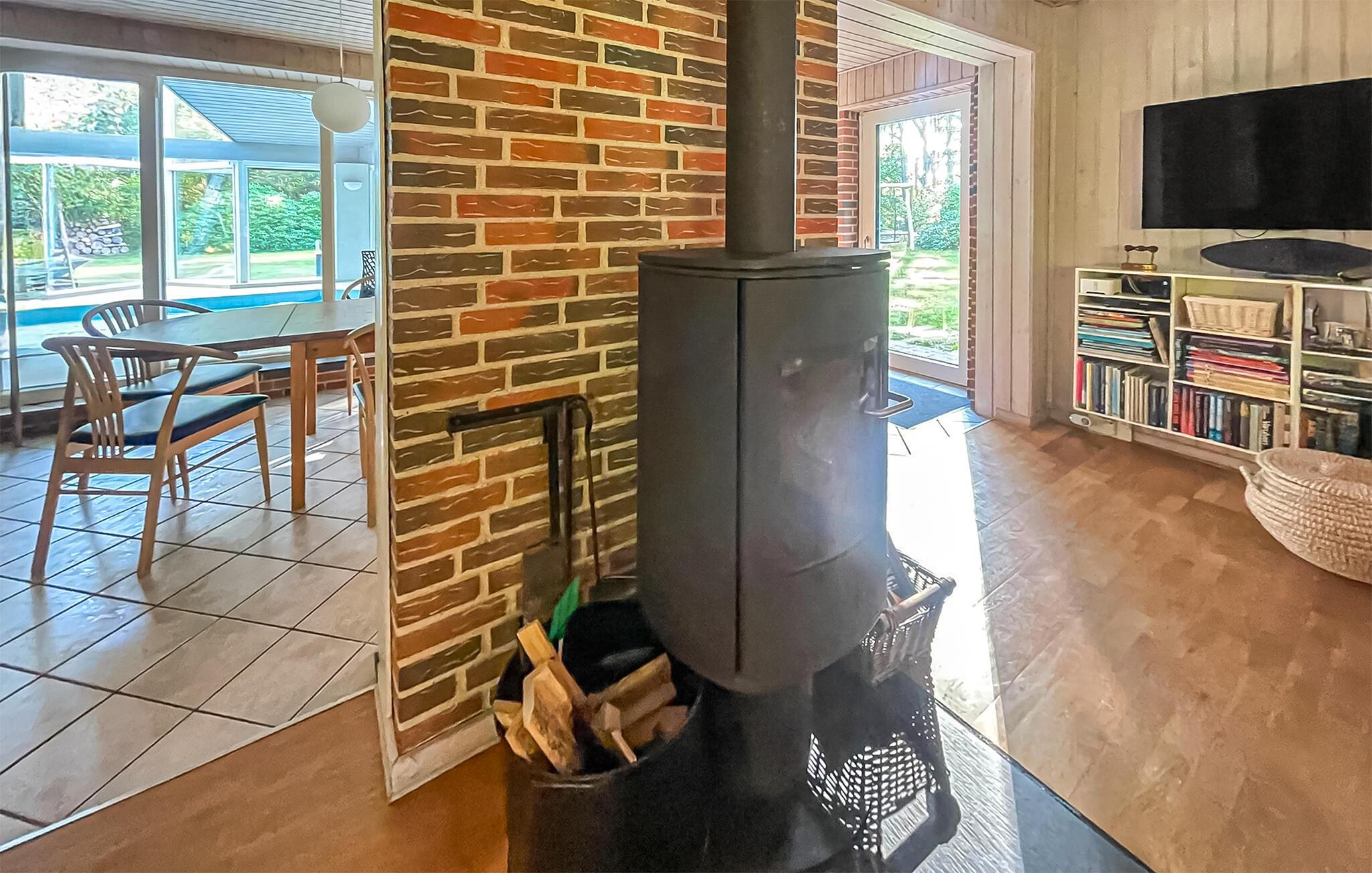 Husets absolut største attraktion er den 18 m2 dejligt tempererede swimmingpool. Fra poolafdelingen, som også indeholder et spabad, er der udsigt til haven gennem de store panoramavinduer. Derudover er der adgang til sauna og brusekabine. Fra den veludstyrede køkkenafdeling er der udsigt over den store, hyggelige opholdsstue indrettet med brændeovn og komfortable møbler. De fire rummelige soveværelser og hemsen giver sovepladser til to familier. Der er gulvvarme i en stor del af huset. I øvrigt er der også to badeværelser.