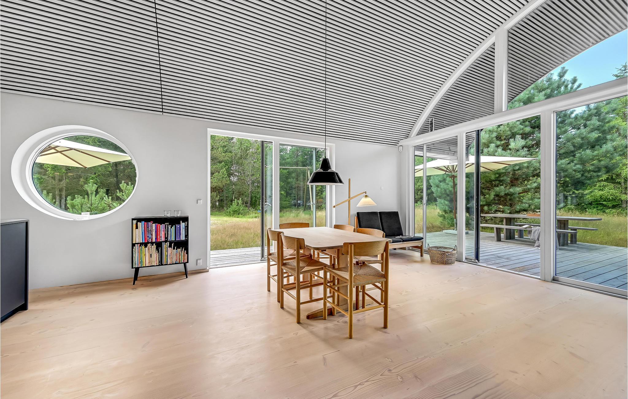 Unikt arkitekttegnet feriehus nær børnevenlig sandstrand med åbent køkken-alrum, hems og flere terrasser.