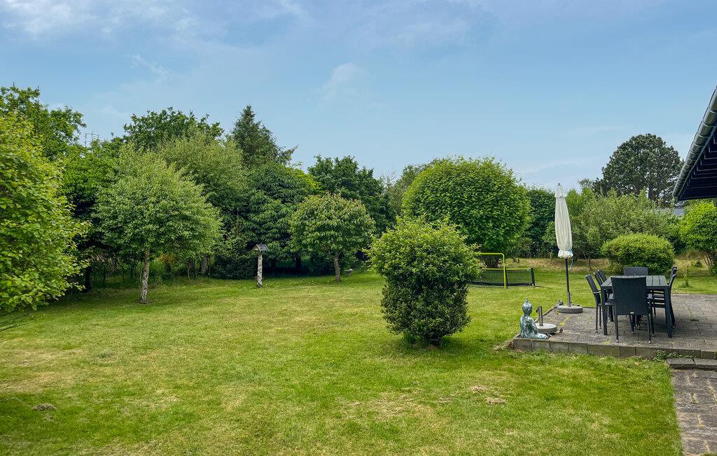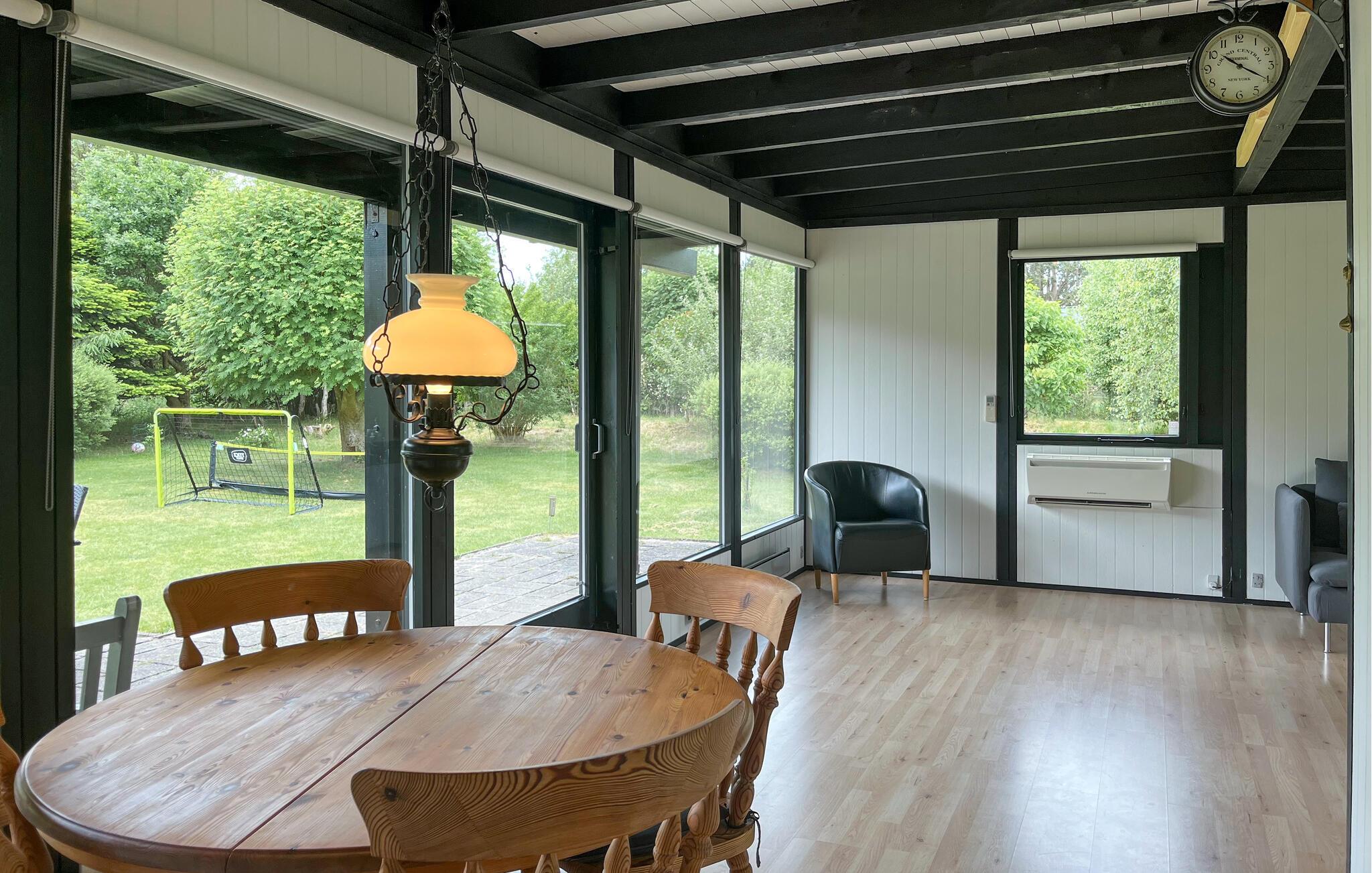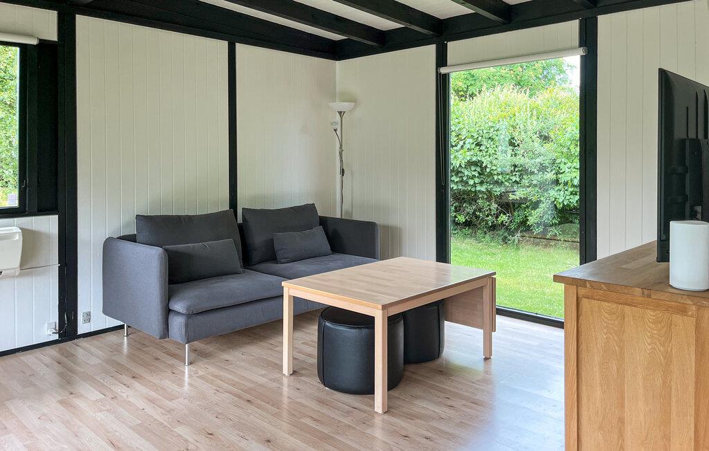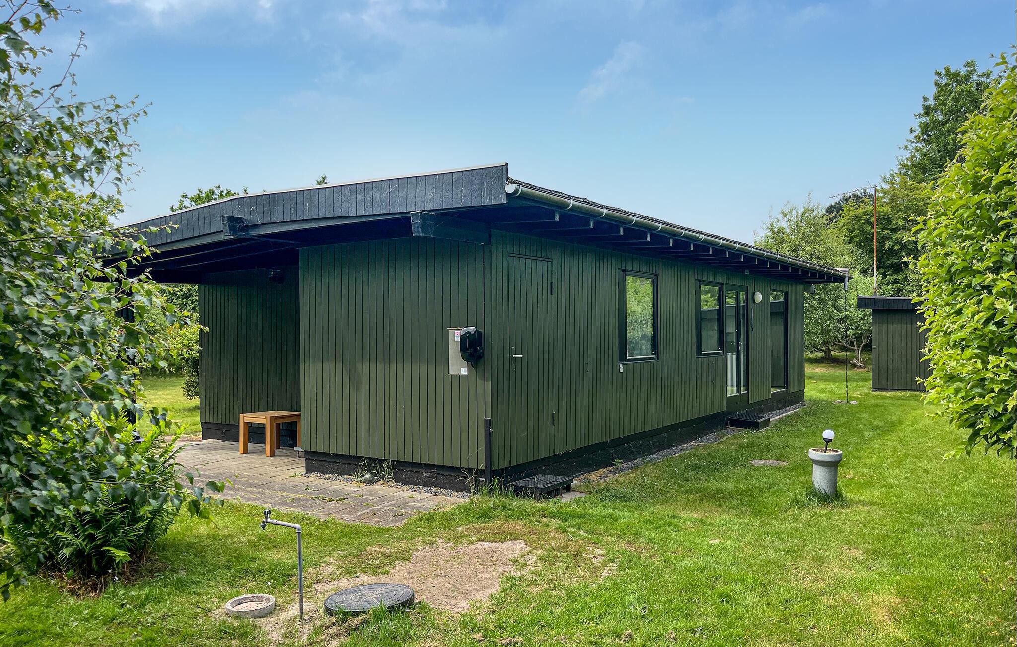 I dette etplans feriehus har I udsigt over den frodige have fra stort set hvor som helst takket være de store vinduer. Tilbered lækre retter, nyd en afslappet snak over måltiderne i den åbne stue og sæt jer til rette i sofaen til en afslappende aften foran tv'et eller et sjovt brætspil.