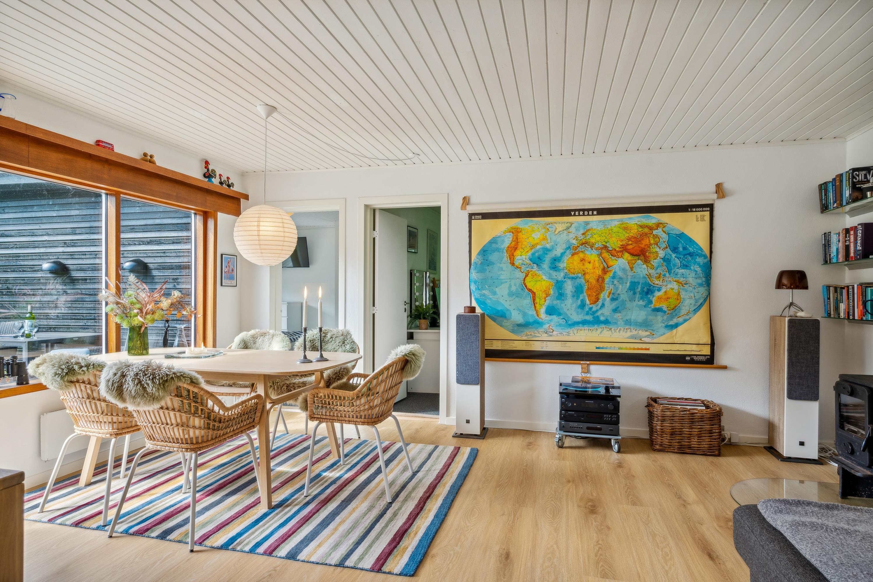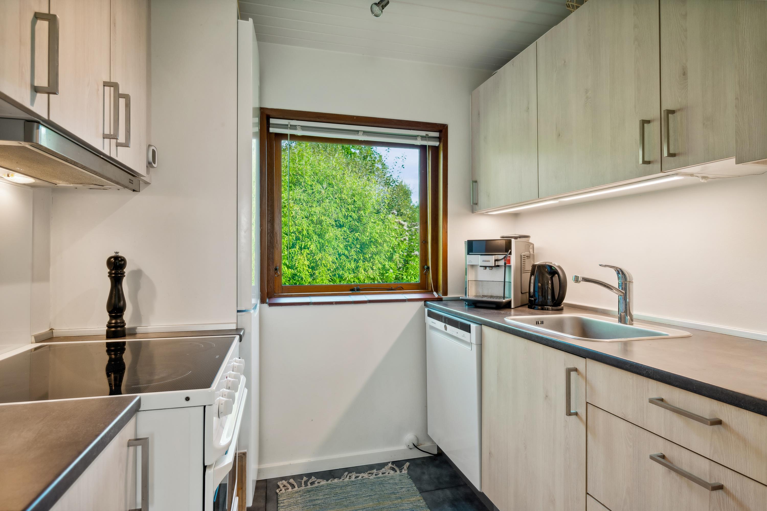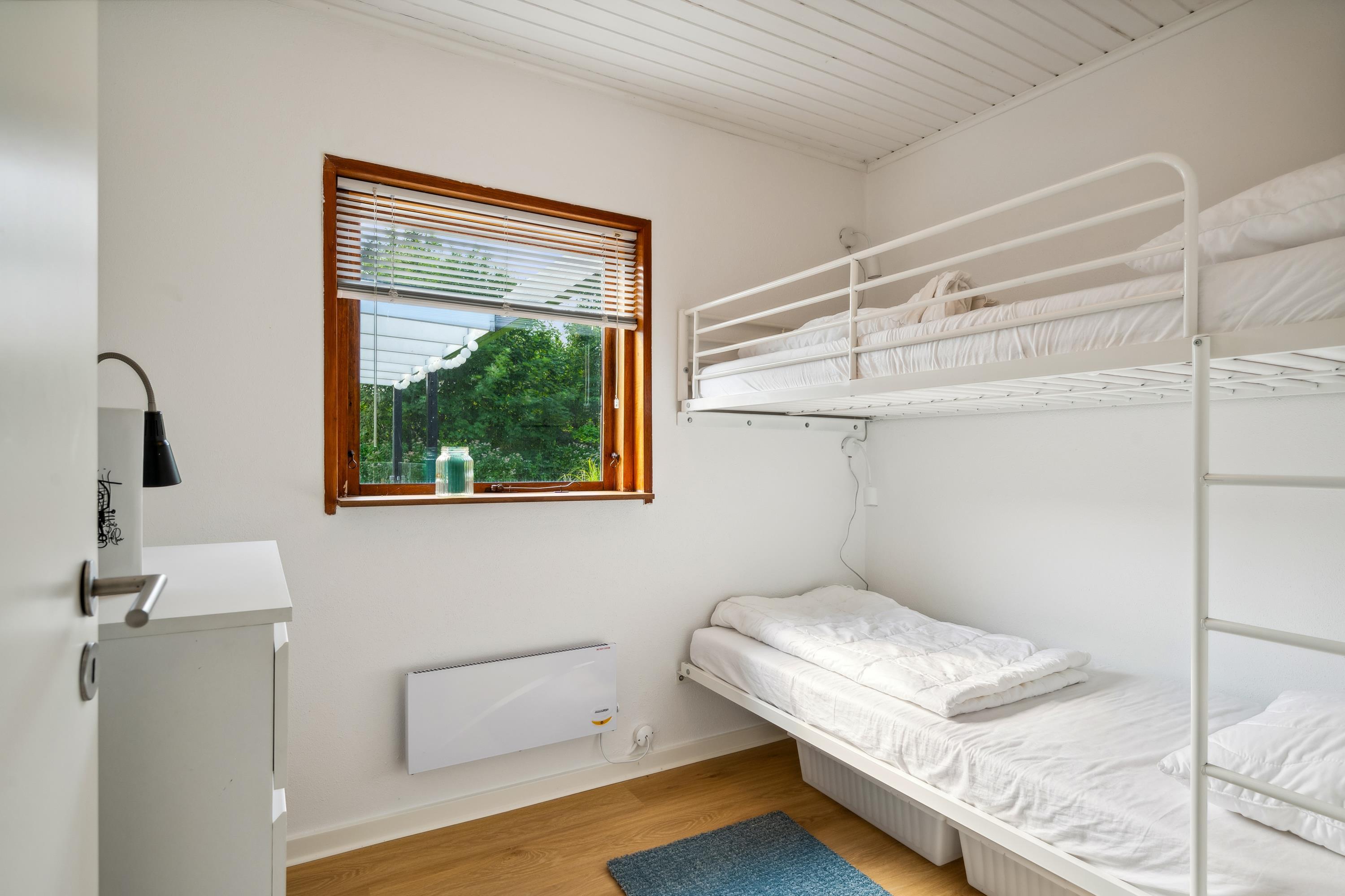 Den lyse og velmøblerede stue med udgang til terrasse har god spiseplads til 6 personer, brændeovn, TV med gratis kanaler, CD-afspiller samt radio. Hyggeligt og veludstyret køkken med komfur med keramiske kogeplader og ovn, køle-/fryseskab, opvaskemaskine og mikrobølgeovn. Huset rummer 2 store, lyse soveværelser med dobbeltseng – det ene med udgang til terrasse – og et lidt mindre værelse med køjeseng. Nyere, pænt badeværelse – bemærk, at brusenichen er temmelig smal. Der er internetadgang. Et virkelig hyggeligt hus med ægte sommerhusstemning både ude og inde.