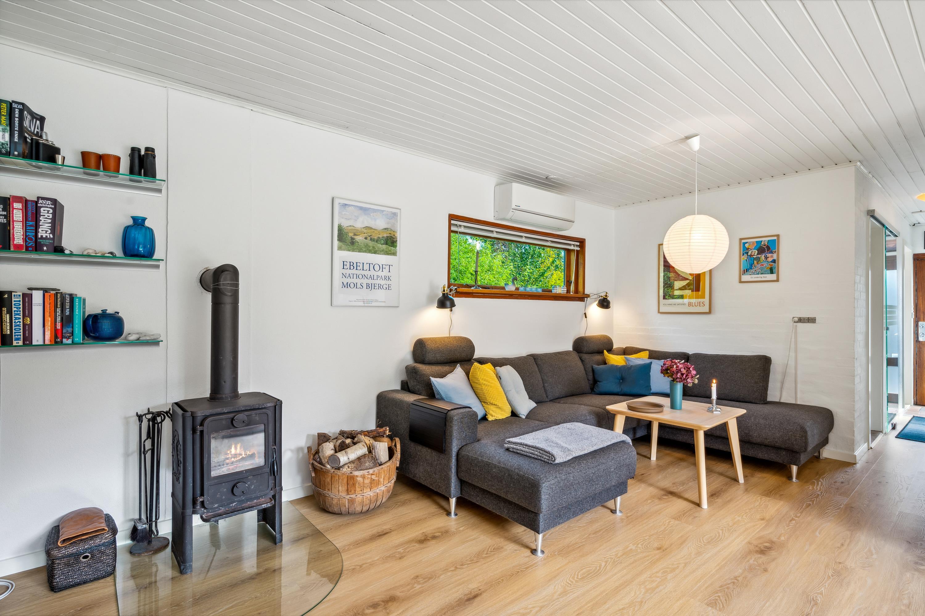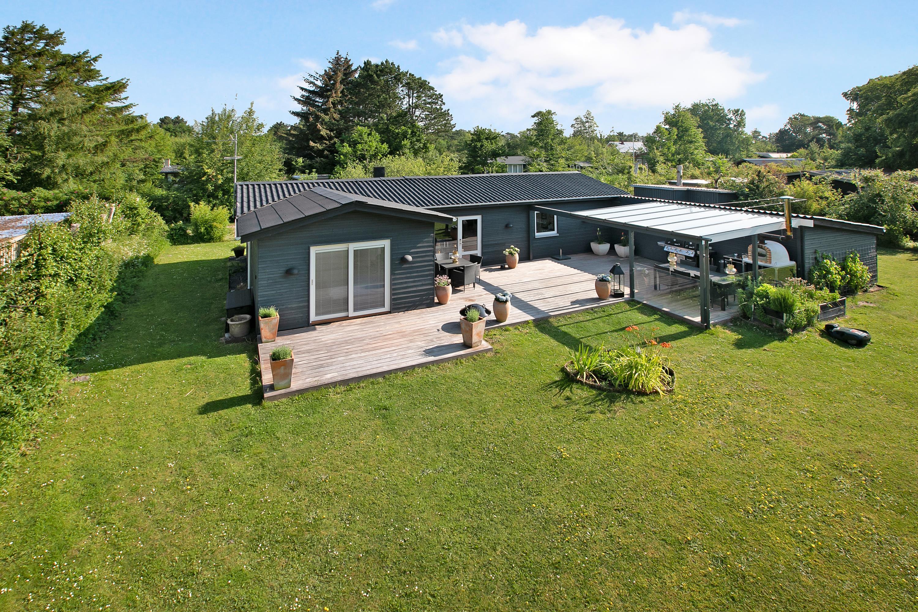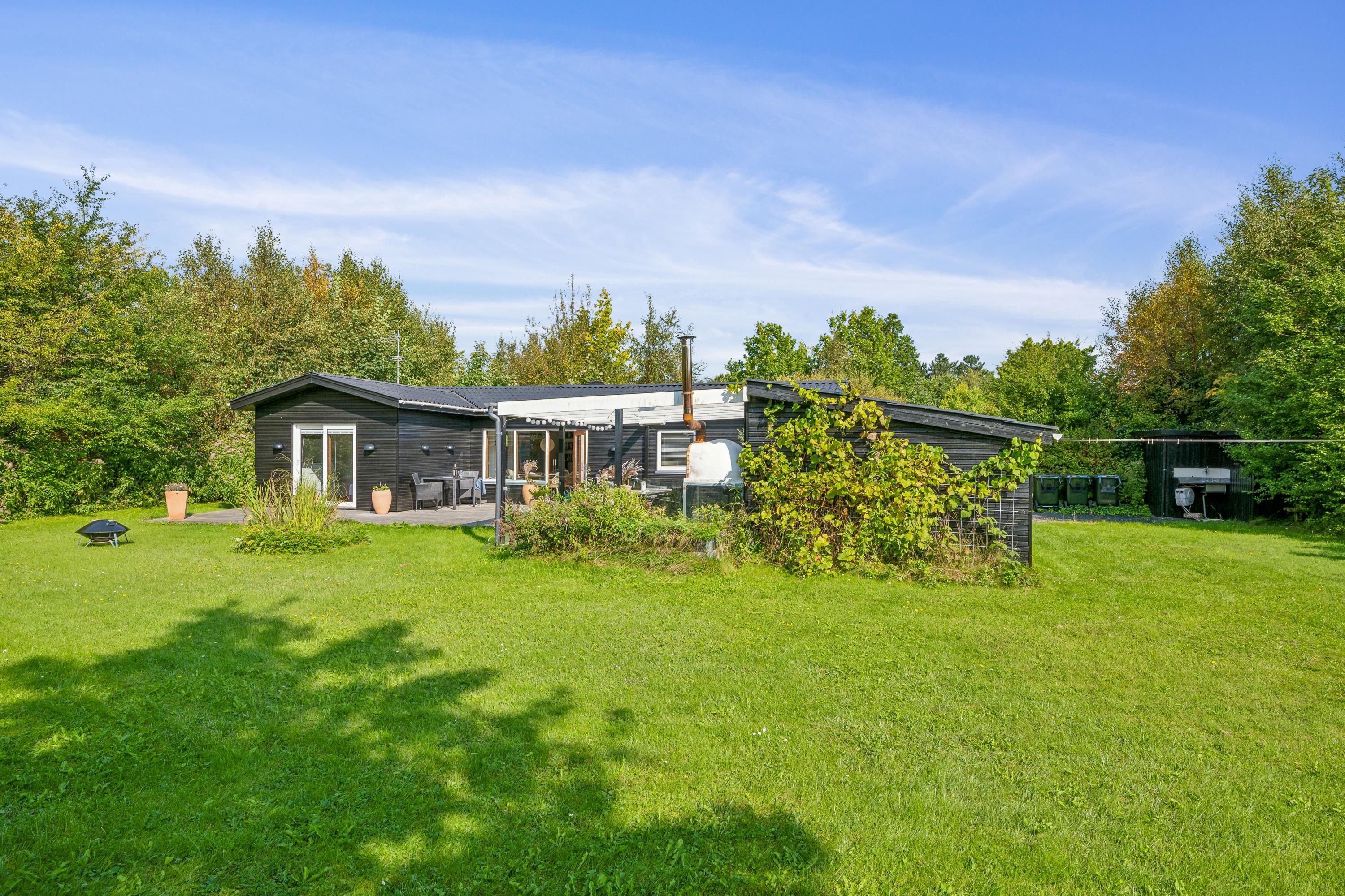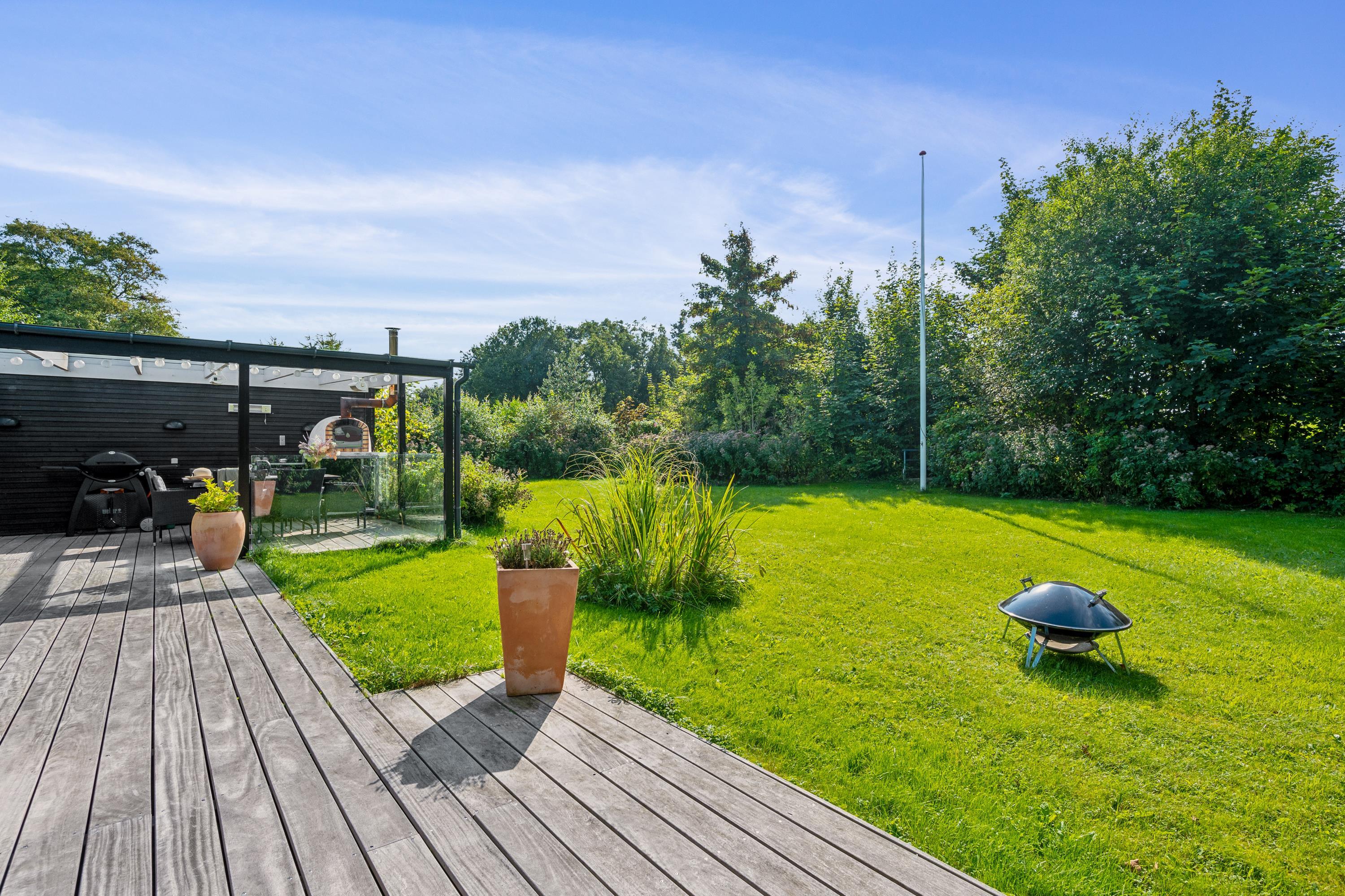 Hyggeligt feriehus nær Elsegårde Strand med stor terrasse, pizzaovn og ladestander til elbil.