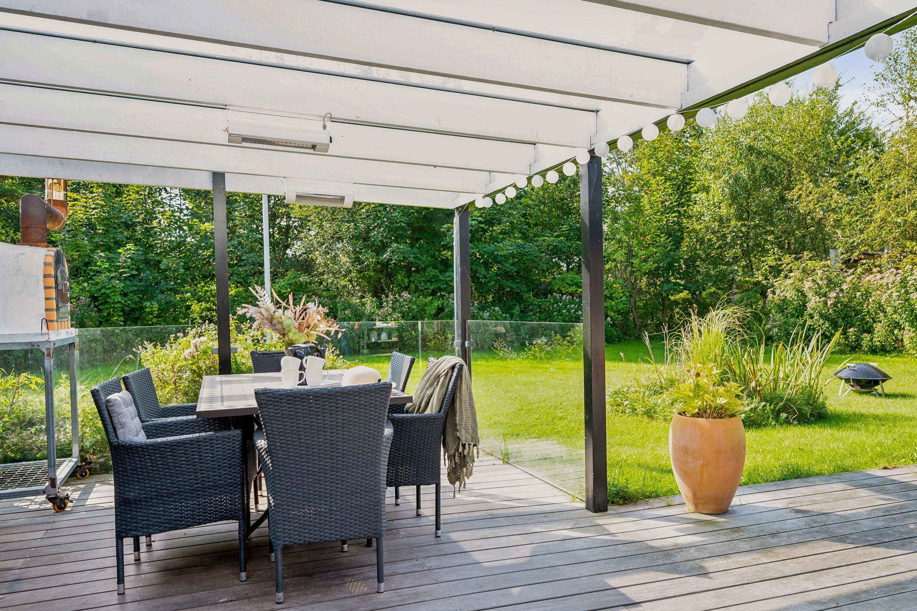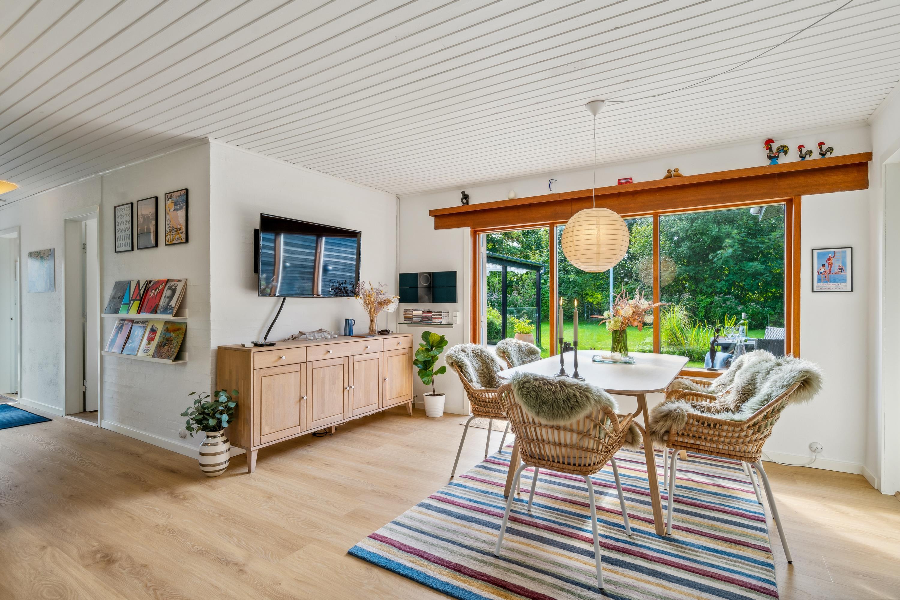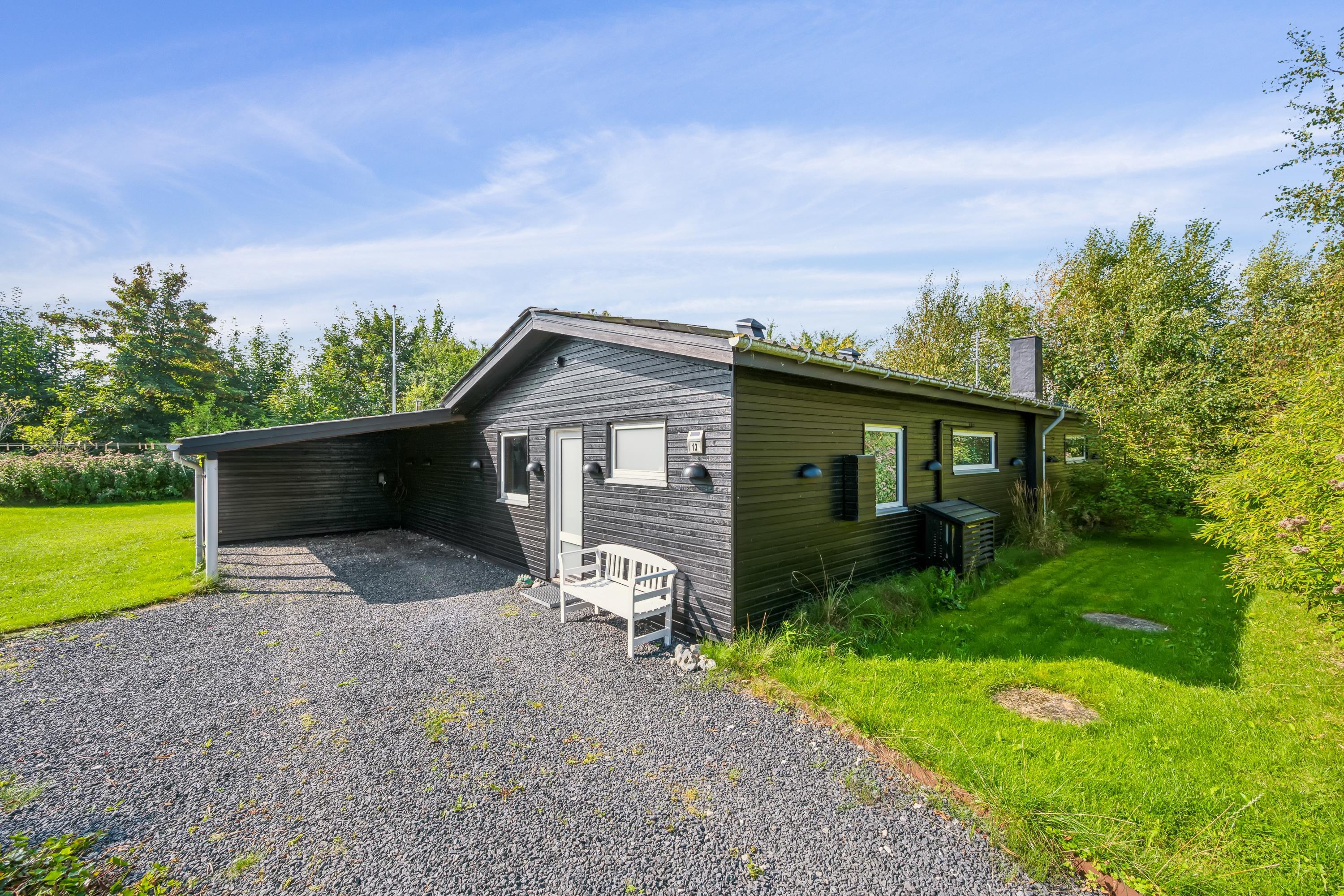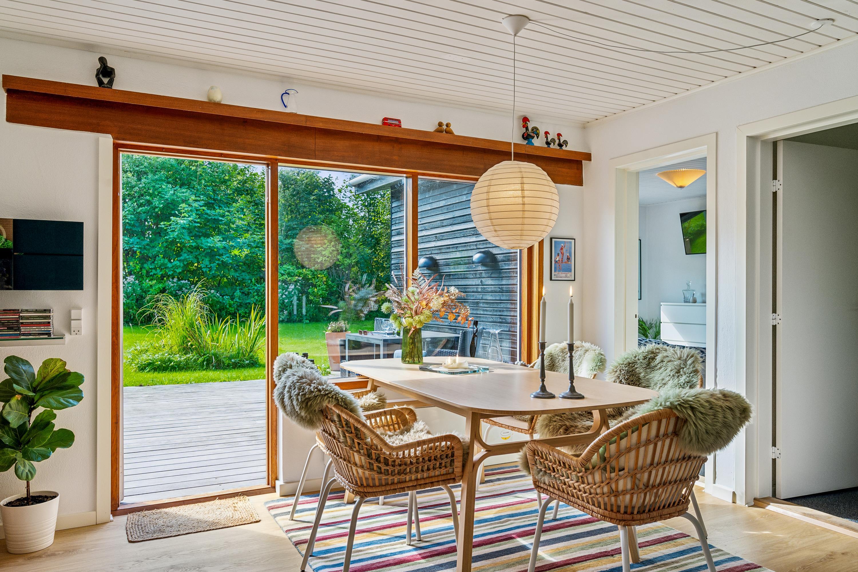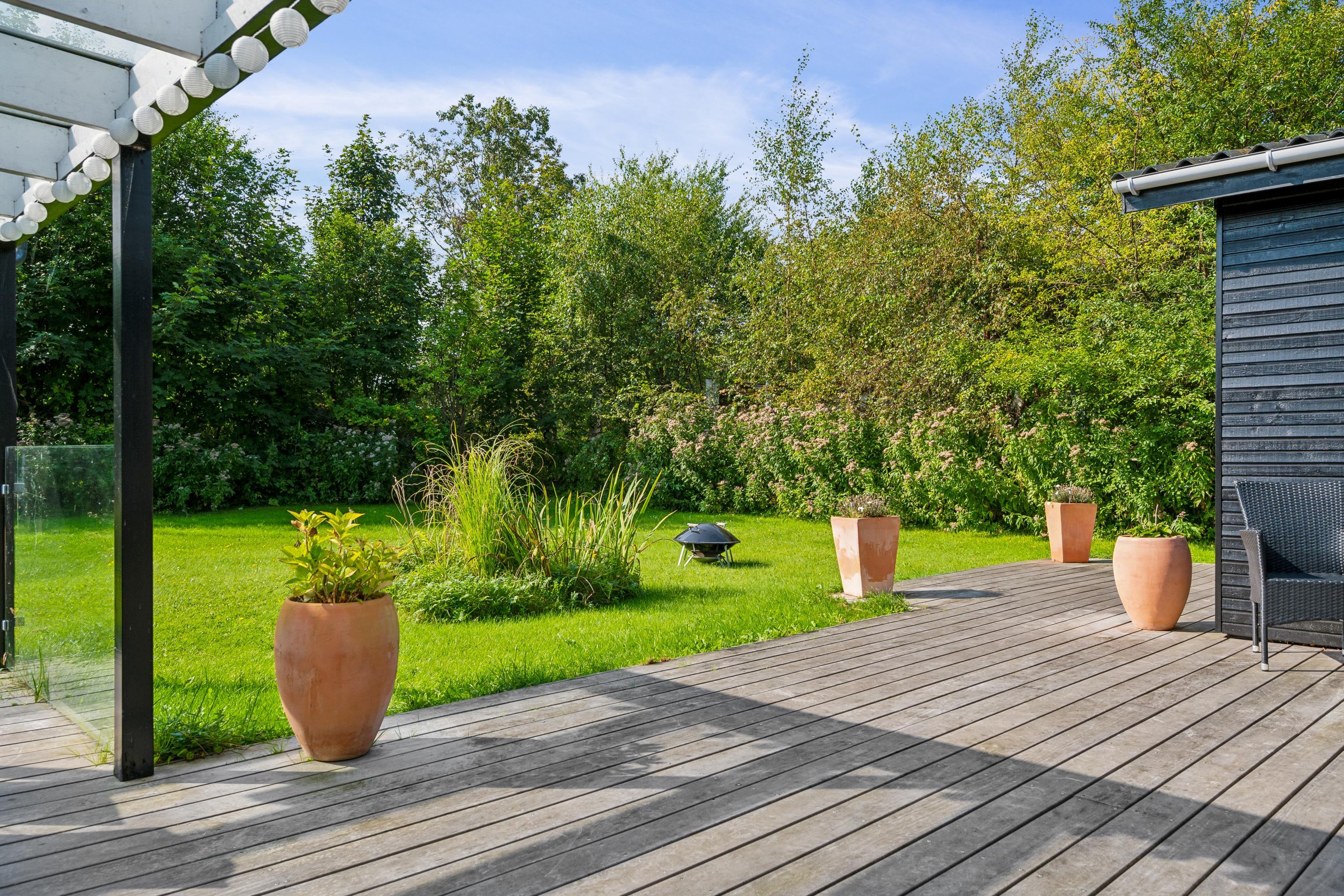 Hyggeligt feriehus nær Elsegårde Strand med stor terrasse, pizzaovn og ladestander til elbil.