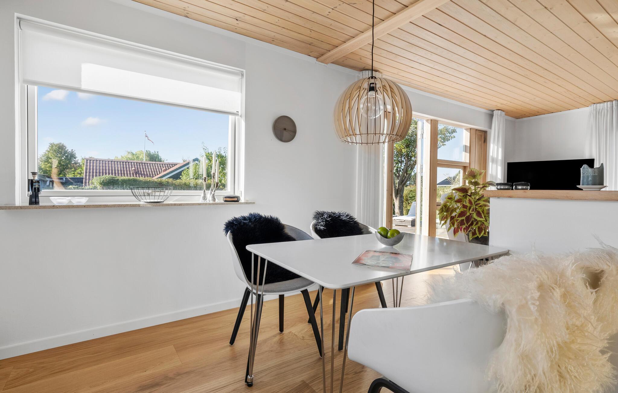 Uanset om I leder efter en aktiv ferie eller en skøn oase, tilbyder dette hus de ideelle rammer for et vellykket ophold. De fine indretningsløsninger og den indbydende grund i jeres feriehus skaber de perfekte rammer for en varieret og afslappende ferie. Et hyggeligt sofahjørne venter jer i den lyse opholdsstue og lægger op til at slappe af. Det åbne design kombinerer køkken, spisestue og opholdsstue på en harmonisk måde. Nyd måltiderne sammen ved spisebordet, mens det veludstyrede køkken er ideelt til kulinariske aftener med venner.