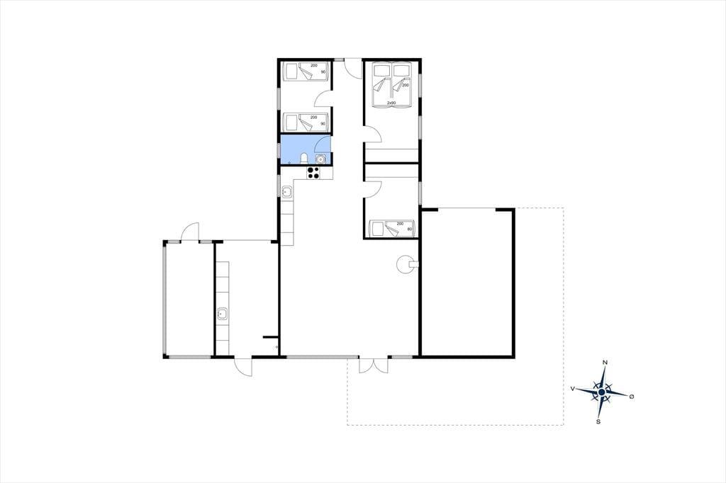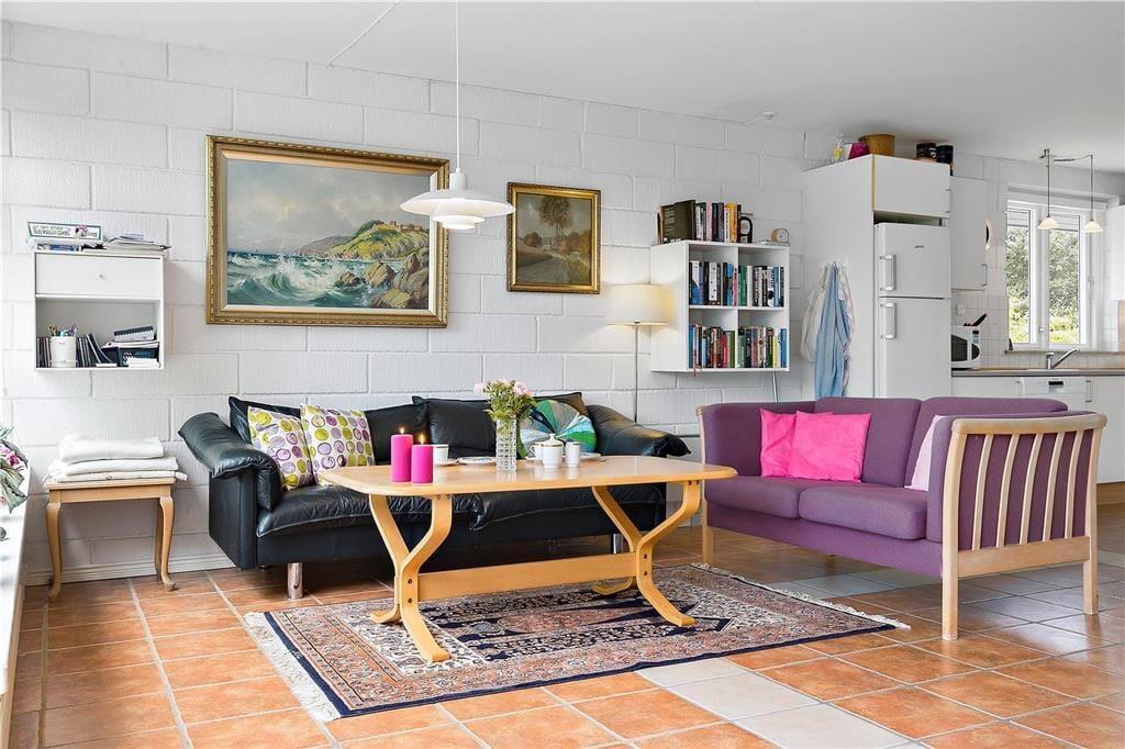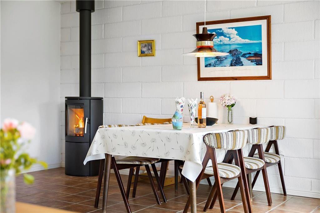 Feriehuset er indrettet med kombineret køkken og opholds- og spisestue. Køkken med køleskab, elkomfur/ ovn og opvaskemaskine. Stor opholdsstue med fint lysindfald. I opholdsstuen er der brændeovn, og tv med danske kanaler. Badeværelse med bruseniche, toilet og håndvask. 3 soverum. 1 med dobbeltseng, 1 med 2 enkeltsenge og 1 med 1 enkeltseng. Huset opvarmes med brændeovn og elvarme.