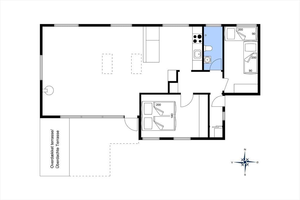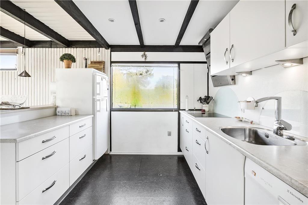 Moderniseret feriehus, beliggende for enden af lukket stikvej og tæt på kyst og strand. Entré med adgang til stue og værelser. Komb. opholds/-spisestue med brændeovn. Udgang til delvis overdækket terrasse. Køkken-alrum med køleskab, fryser, microvn, komfur m. ovn, opvaskemaskine. 2 soverum, 1 med 1 dobb.seng, 1 med 2 enkelsenge. Bad med bruseniche, håndvask, toilet. Vaskemaskine, tørretumbler