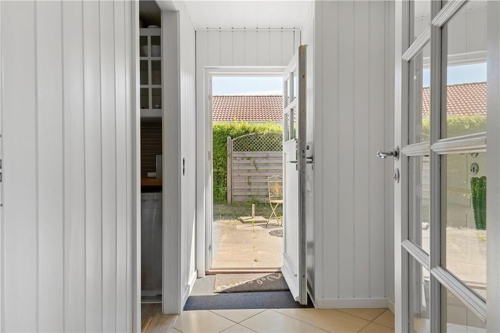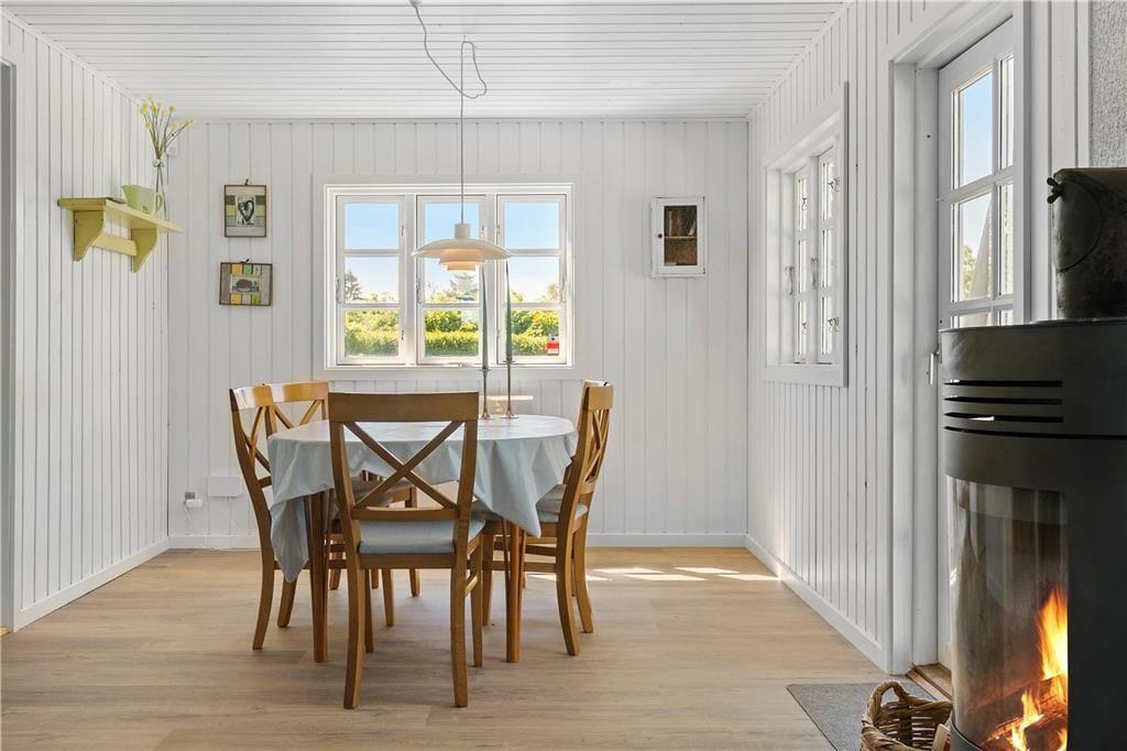 Indendørs: Entré, med adgang til stue og køkken. Komb. opholds/spisestue med brændeovn. Udgang til solrig terrasse. Åbent køkken med køleskab, fryser, Induktionskomfur med ovn, opvaskemaskine samt vaskemasine med tumblerfunktion. 3 soverum, 1 med 1 dobb.seng, 1 med 1 dobb.sovesofa samt 1 med køjeseng (70x200 cm). Nydelig badeværelse med håndvask/underskab, bruseniche. Gulvvarme på badeværelse.
