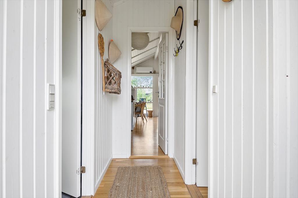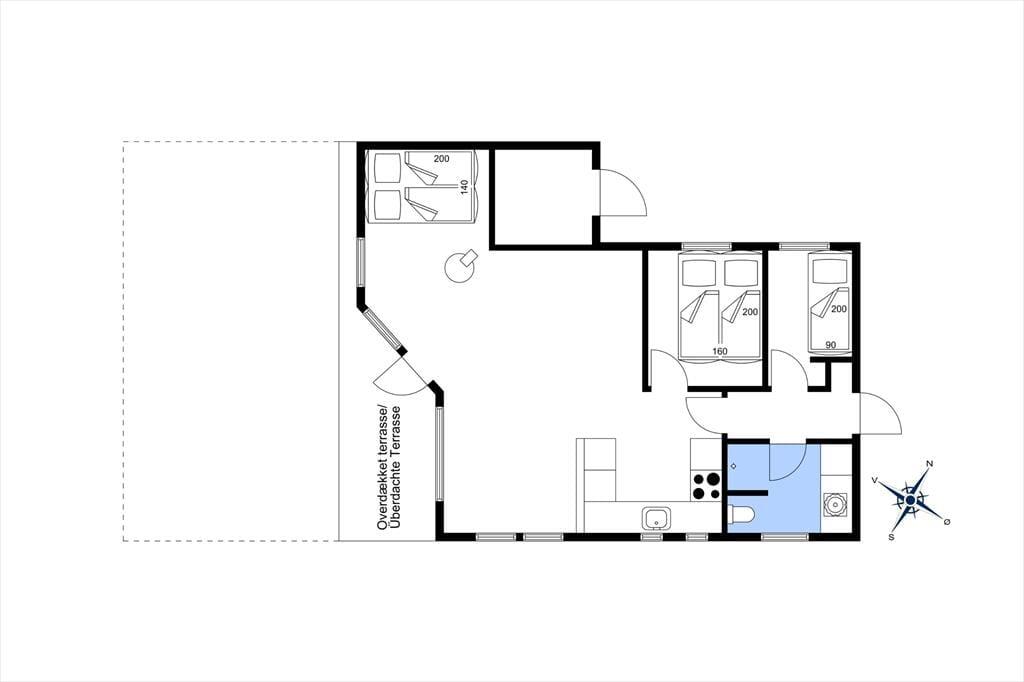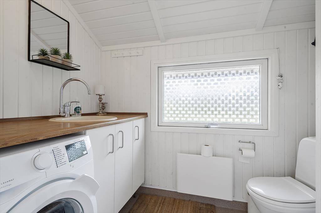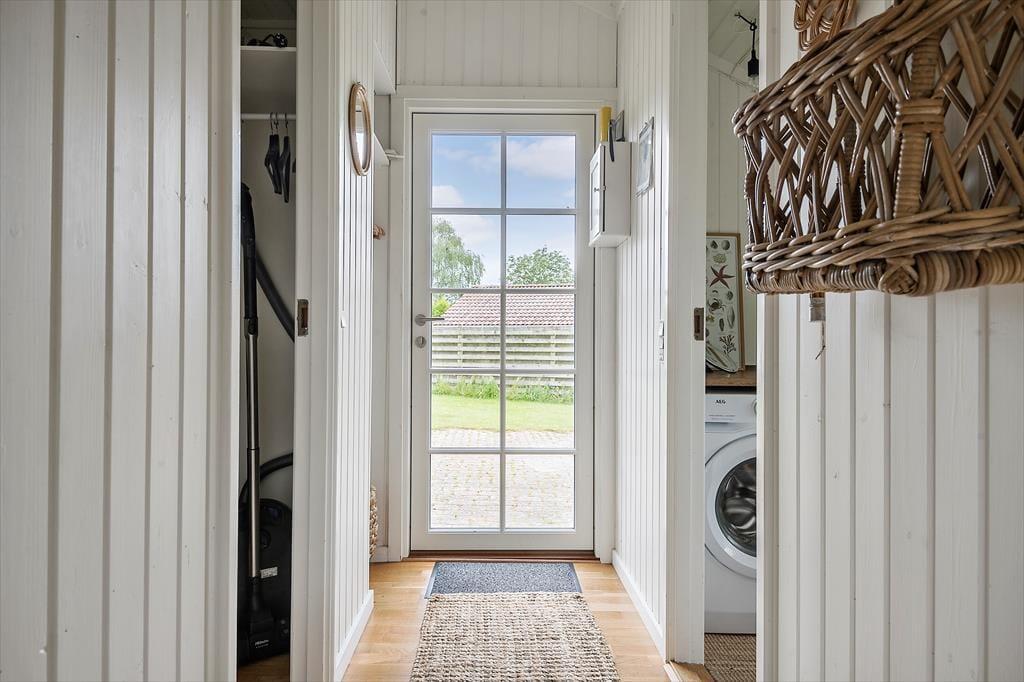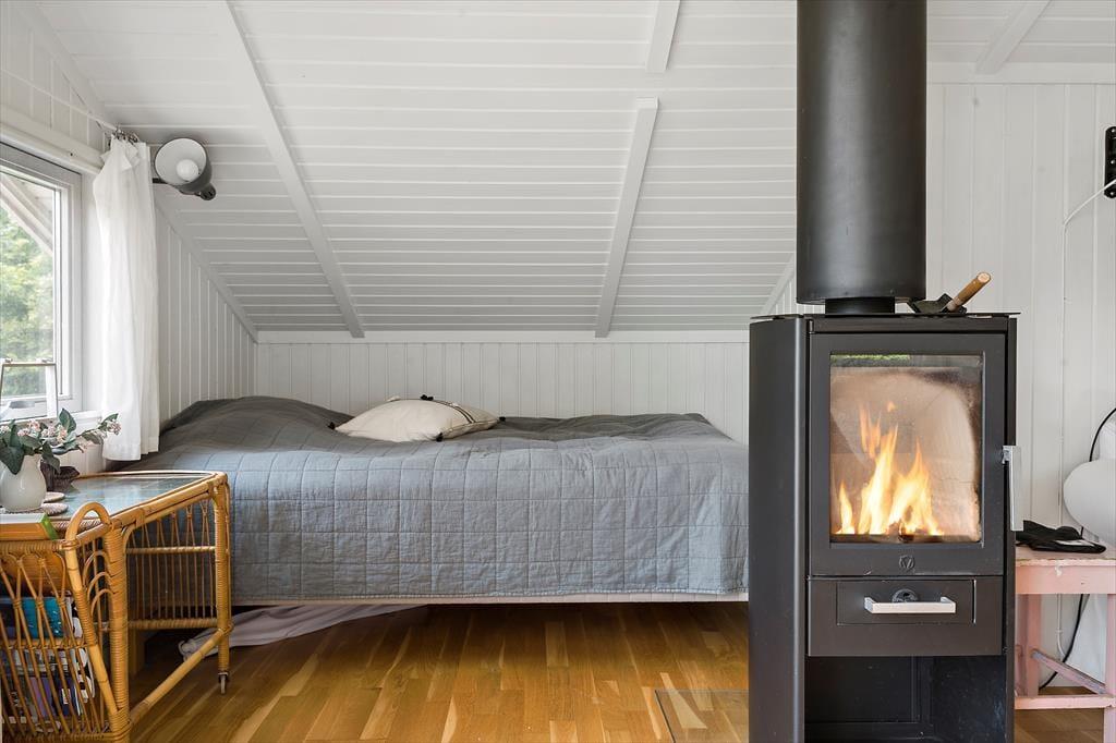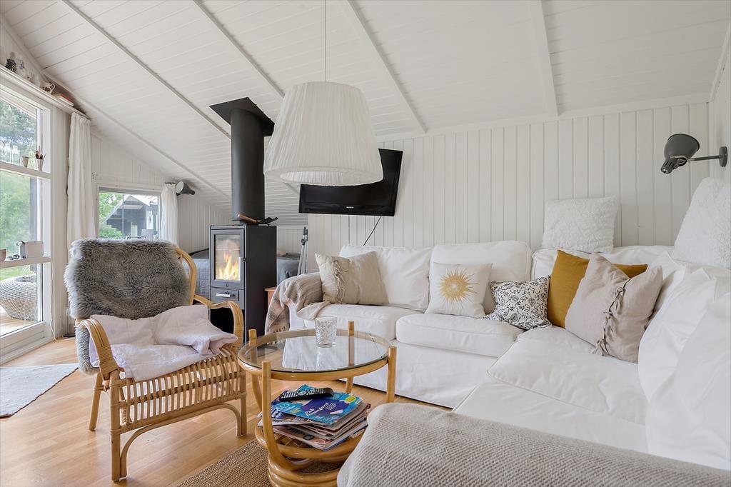 Velkommen indenfor: Træd ind i den lyse entré, hvorfra du har adgang til både stuen og værelserne. Den kombinerede opholds- og spisestue indbyder til samvær og hygge. Tænd op i brændeovnen på de kolde aftener og skab den perfekte sommerhusstemning. En lille alkove giver en ekstra opredning, og fra stuen er der udgang til terrassen. Det åbne køkken er veludstyret med køleskab, fryser, komfur med ovn og opvaskemaskine, så du nemt kan tilberede lækre måltider. To soveværelser - det ene med en dobbeltseng og det andet med en enkeltseng. Badeværelset har bruseniche, håndvask, toilet og en vaskemaskine.