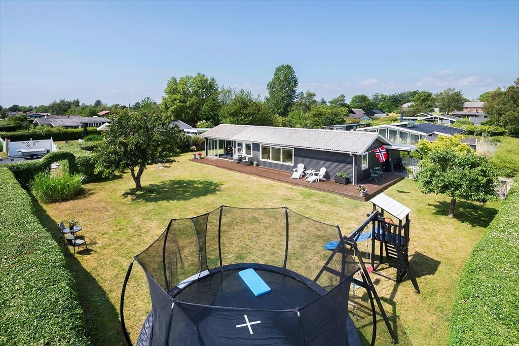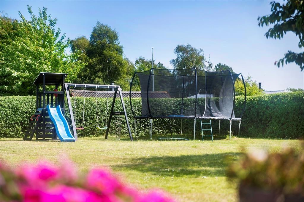 Udendørs: Solrig og ugenert have, omkranset af hæk. Gynge og trambolin.