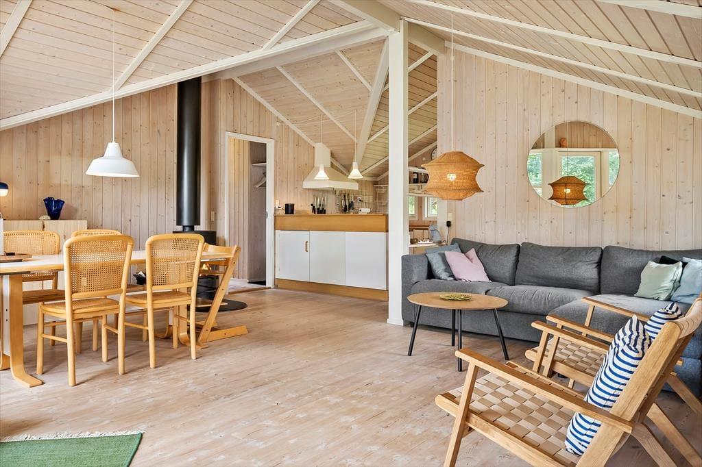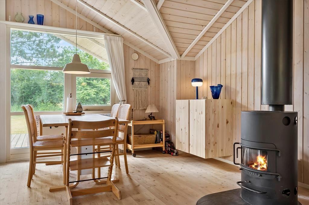 Velkommen indenfor: Sommerhuset indeholder entre med fordelingsgang til stue og værelser. Kombineret opholds/spisestue med moderne indretning og brændeovn, hvor du kan tænde op på de køligere dage - og lade feriestemningen brede sig. Alkove med 1-2 børneopredninger. Fra stuen udgang til stor solrig terrasse. Helt nyt åbent køkken med indbygget kogeplade og ovn. Desuden køleskab, fryser og opvaskemaskine. Sommerhuset råder over 2 soveværelser, 1 med 1 dobb. seng (160x200), 1 med 2 enkeltsenge (90x200). Et dejligt badeværelse med et flot nyt badmiljø med indbygget håndvask og en kombineret vaskemaskine/tørretumbler. Bruseniche, toilet og der er desuden gulvvarme på badeværelset til ekstra komfort.