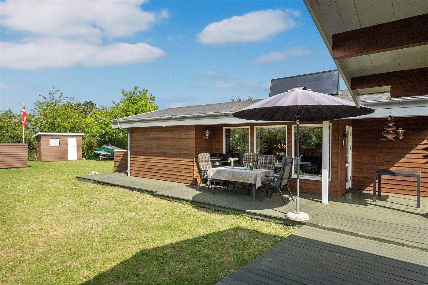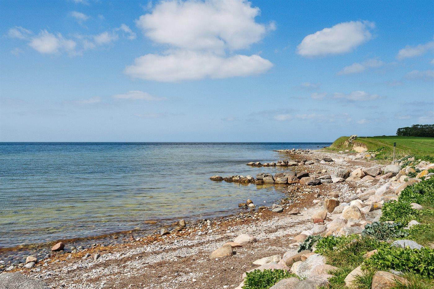 Grunden er en 694 m² stor naturgrund, beliggende blot 250 meter fra både hav og fjord, og der er adgang til badebro i nærheden. Den nærmeste forretning ligger 3 km væk, og der er 7,5 km til den nærmeste golfbane. Udendørs findes både åben og overdækket terrasse, et redskabsrum, samt flere legefaciliteter såsom gynge, sandkasse, rutsjebane og fodboldmål. En legeplads ligger kun 2 km fra huset. Der er grill og carport, og det er muligt at parkere ved huset.