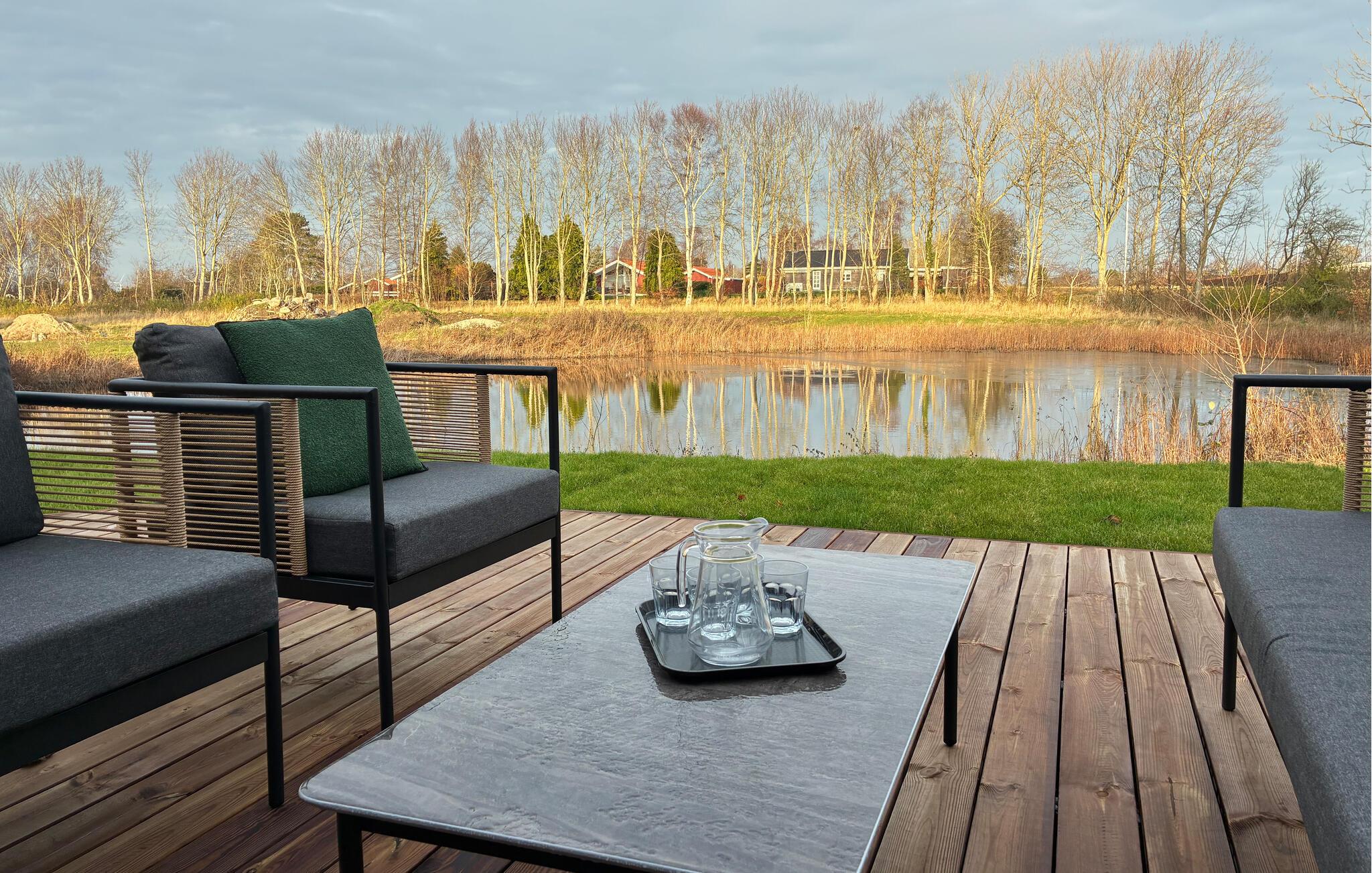 Træd ud i den beskyttede, træbeklædte gårdhave og find jeres yndlingsplads udenfor. Tilbring afslappede timer på loungemøblerne, og nyd den frie udsigt over den lille sø og det omkringliggende landskab. Udnyt den dejlige beliggenhed til afslappede aftener og rolige stunder under åben himmel.
