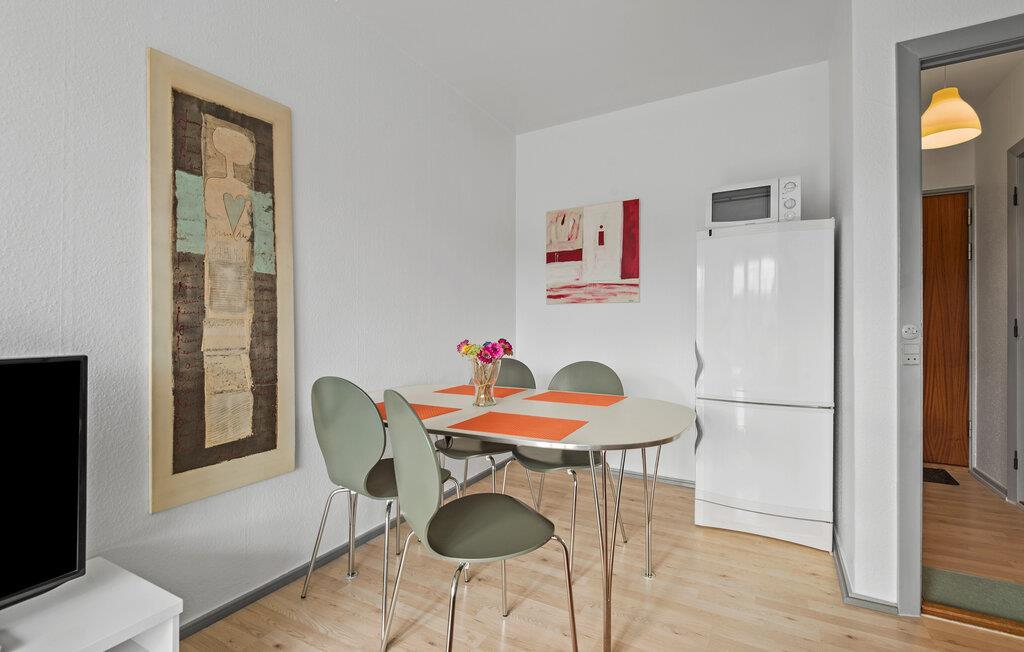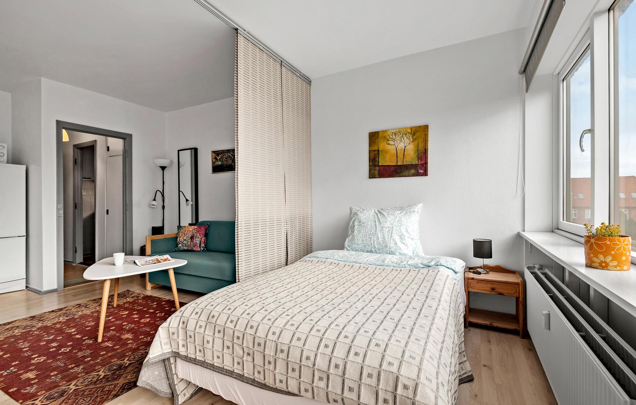 Denne hyggelige, lyse ferielejlighed midt i Esbjerg giver jer den ideelle base til at kombinere byliv og afslapning. Glæd jer til et ophold, hvor I kan føle jer hjemme. Lejligheden er noget særligt med sin smarte udnyttelse af pladsen og smagfuld indretning. Den åbne stue med en behagelig sofa og et fladskærms-tv lægger op til at slappe af. Det tilstødende soveområde, som er adskilt af et gardin, byder på privatliv og en hyggelig atmosfære samt en smuk udsigt over de omkringliggende huse.