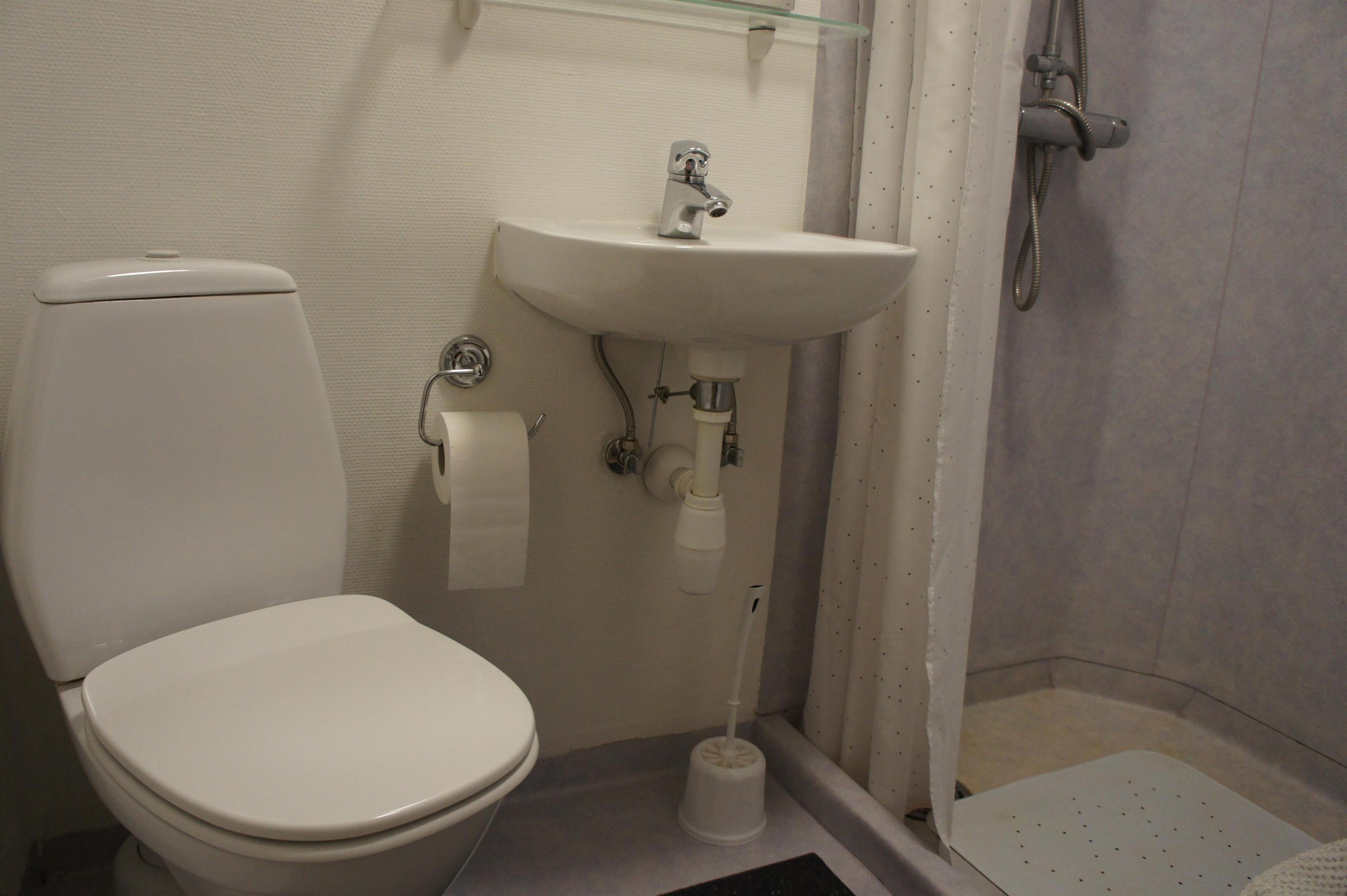 Badeværelse med bruseniche, karbad, toilet og håndvask.