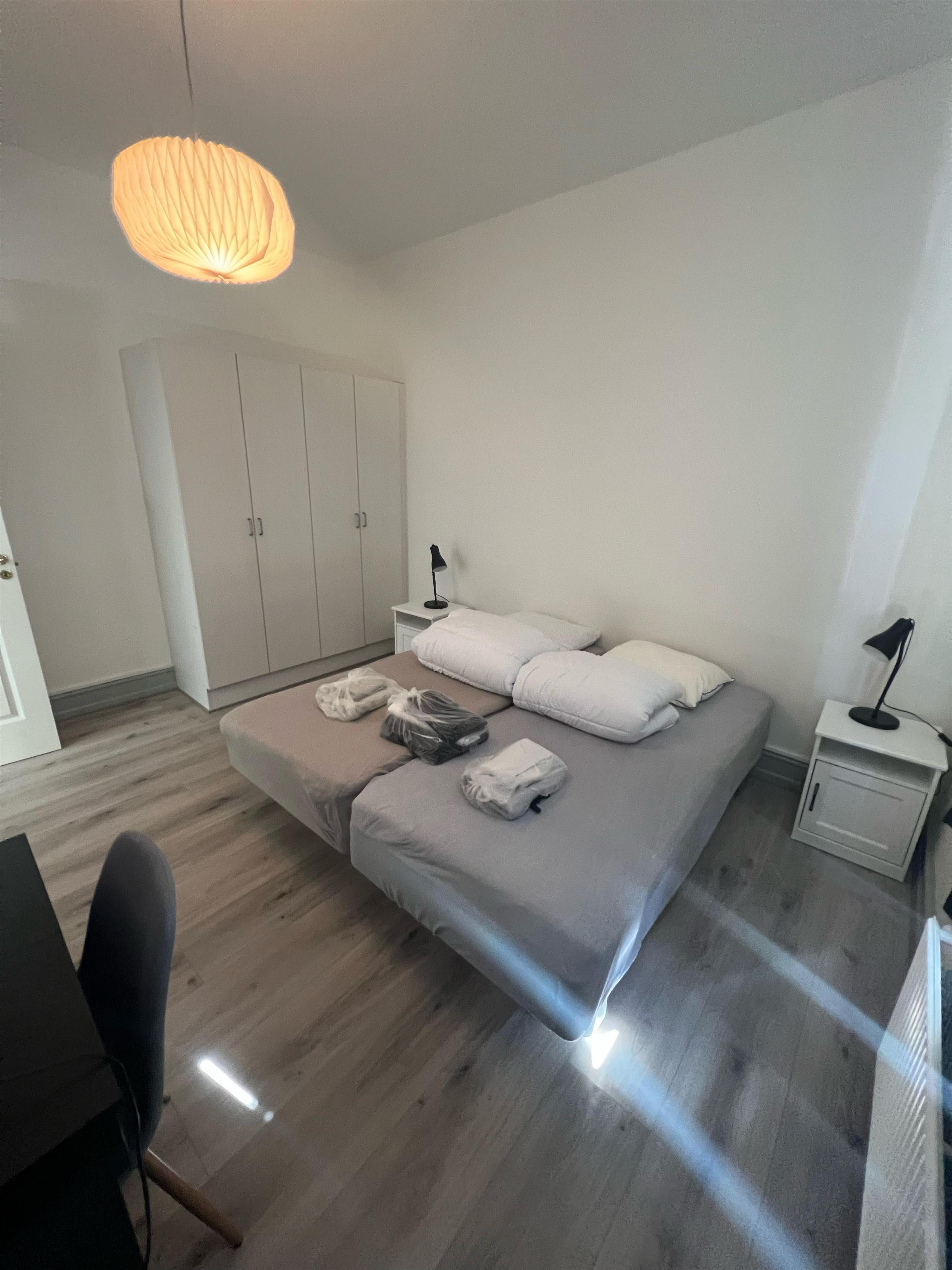 Soveværelse med dobbeltseng og klædeskab