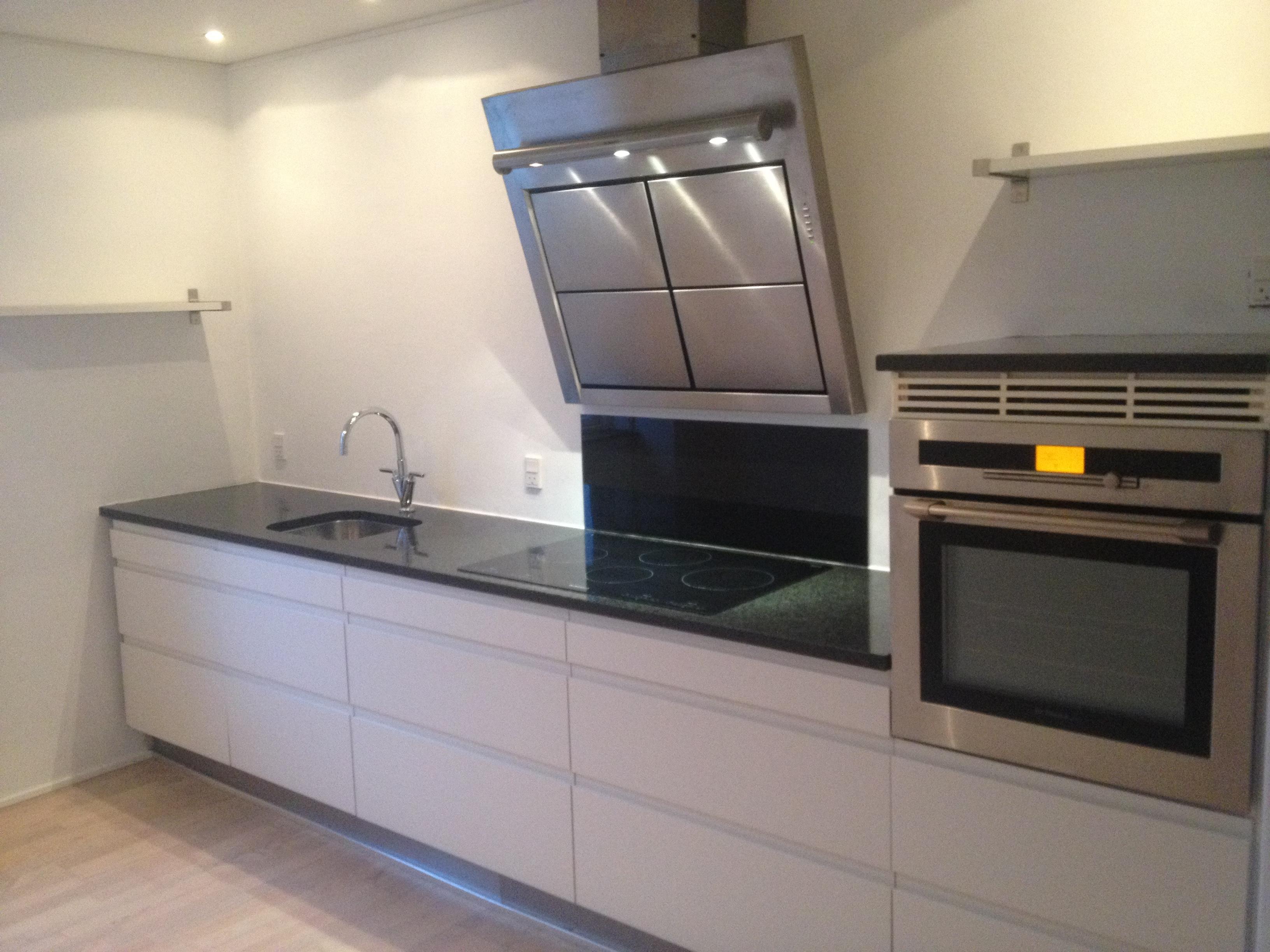 Nyere køkken med opvaskemaskine, køl/frys, induktions komfur, ovn og emhætte.