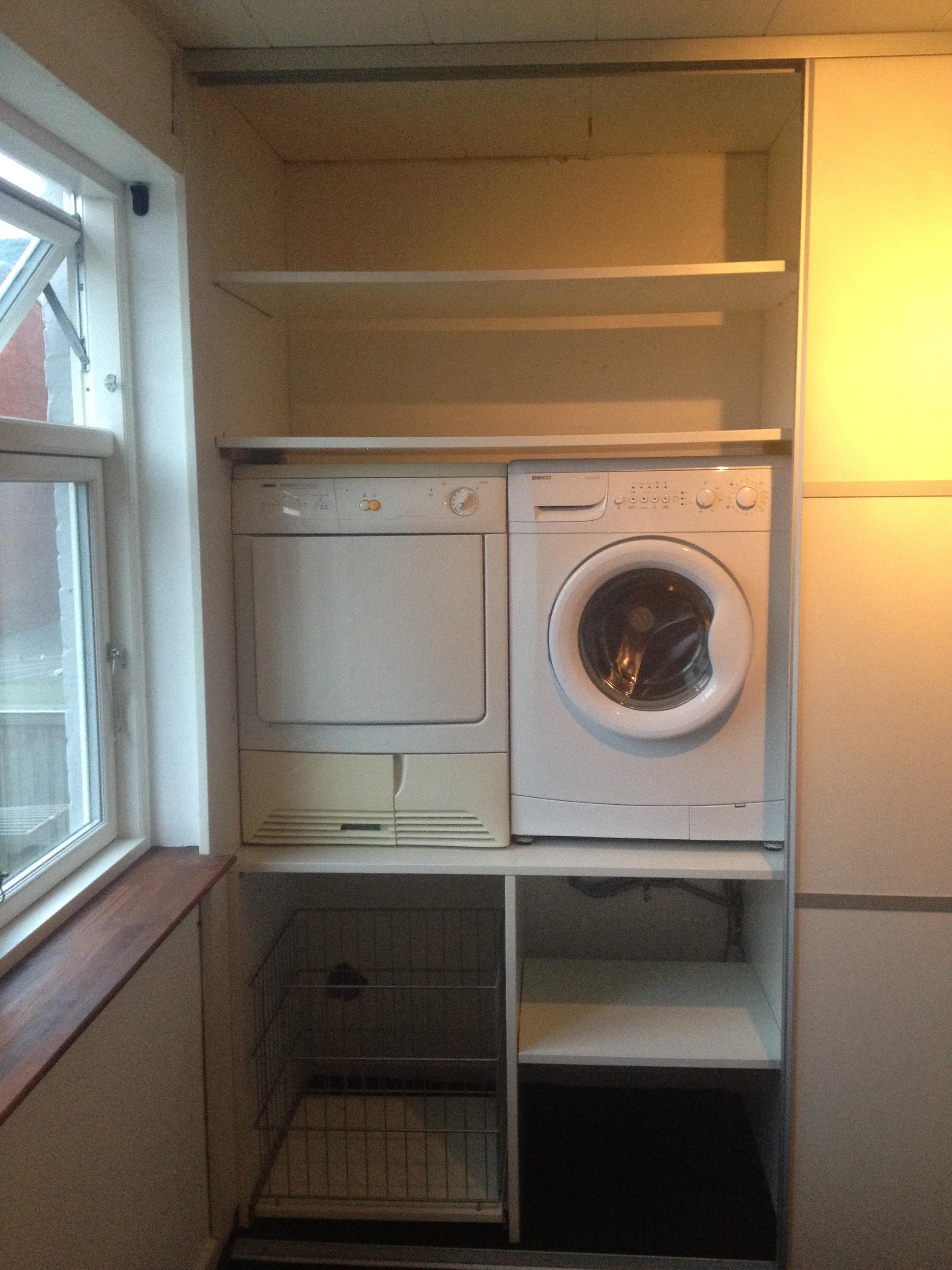 Soveværelse med dobbeltseng. Vaskemaskine og tørretumbler.