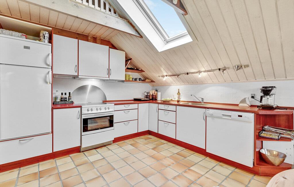 Husets hjerte er den store opholdsstue og spisestue som ligger i forlængelse af det åbne køkken. Ovenlysvinduer og høje lofter giver jer et dejligt lys i hele huset. De større børn vil elske den hyggelige hems, hvor de kan være for sig selv og samtidig følge med i hvad der sker i stuen.