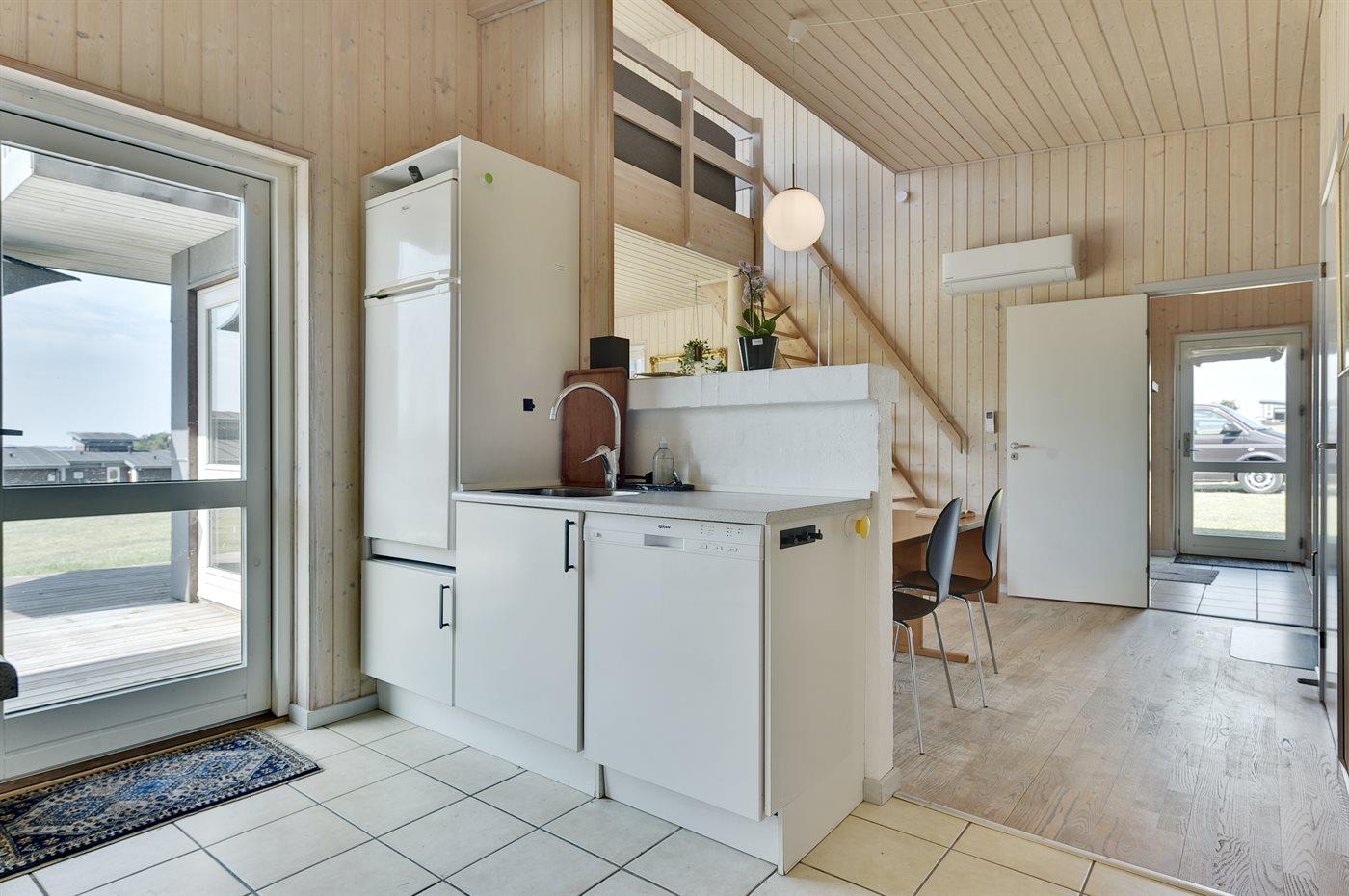 Køkkenet er udstyret med 1 køleskab. Der er 4 keramiske kogeplader, varmluftovn, mikrobølgeovn samt opvaskemaskine Der er gulvvarme i køkkenet.