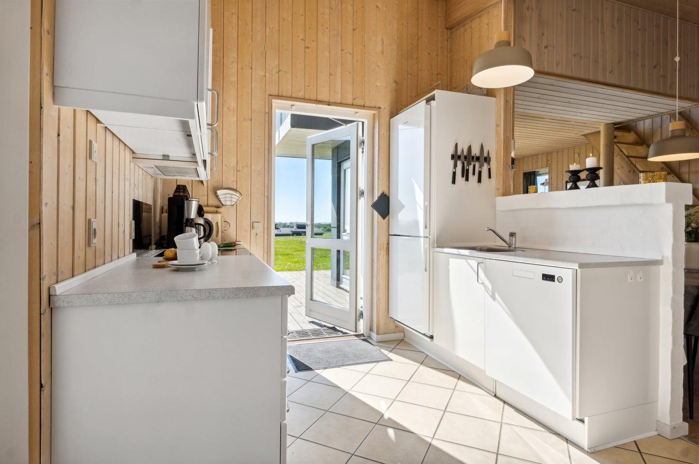 Køkkenet er udstyret med 1 køleskab. Der er 4 keramiske kogeplader, varmluftovn, mikrobølgeovn samt opvaskemaskine.