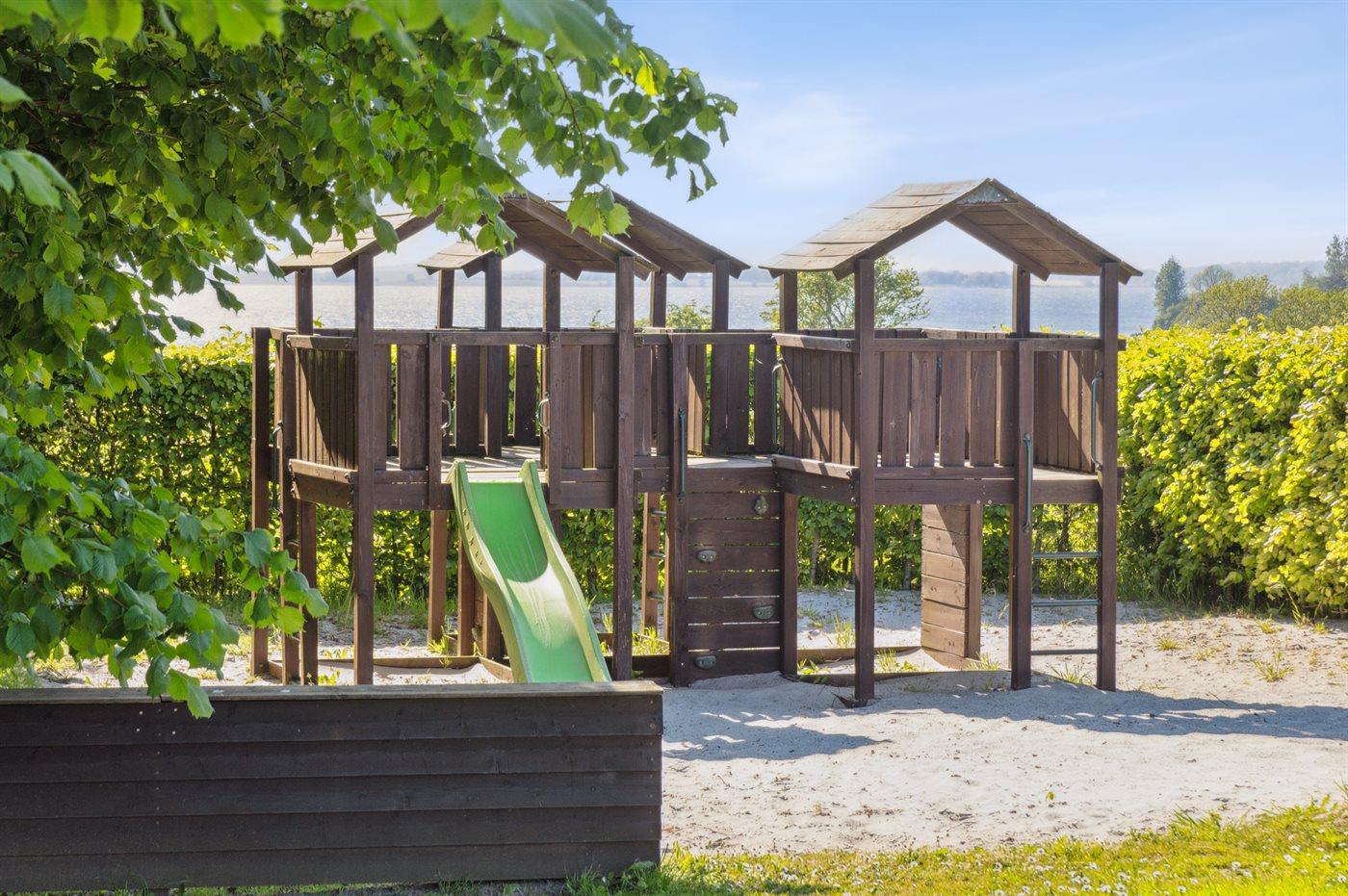 På fællesområdet er der en stor legeplads, og om sommeren er der opsat fælles badebro ved stranden.