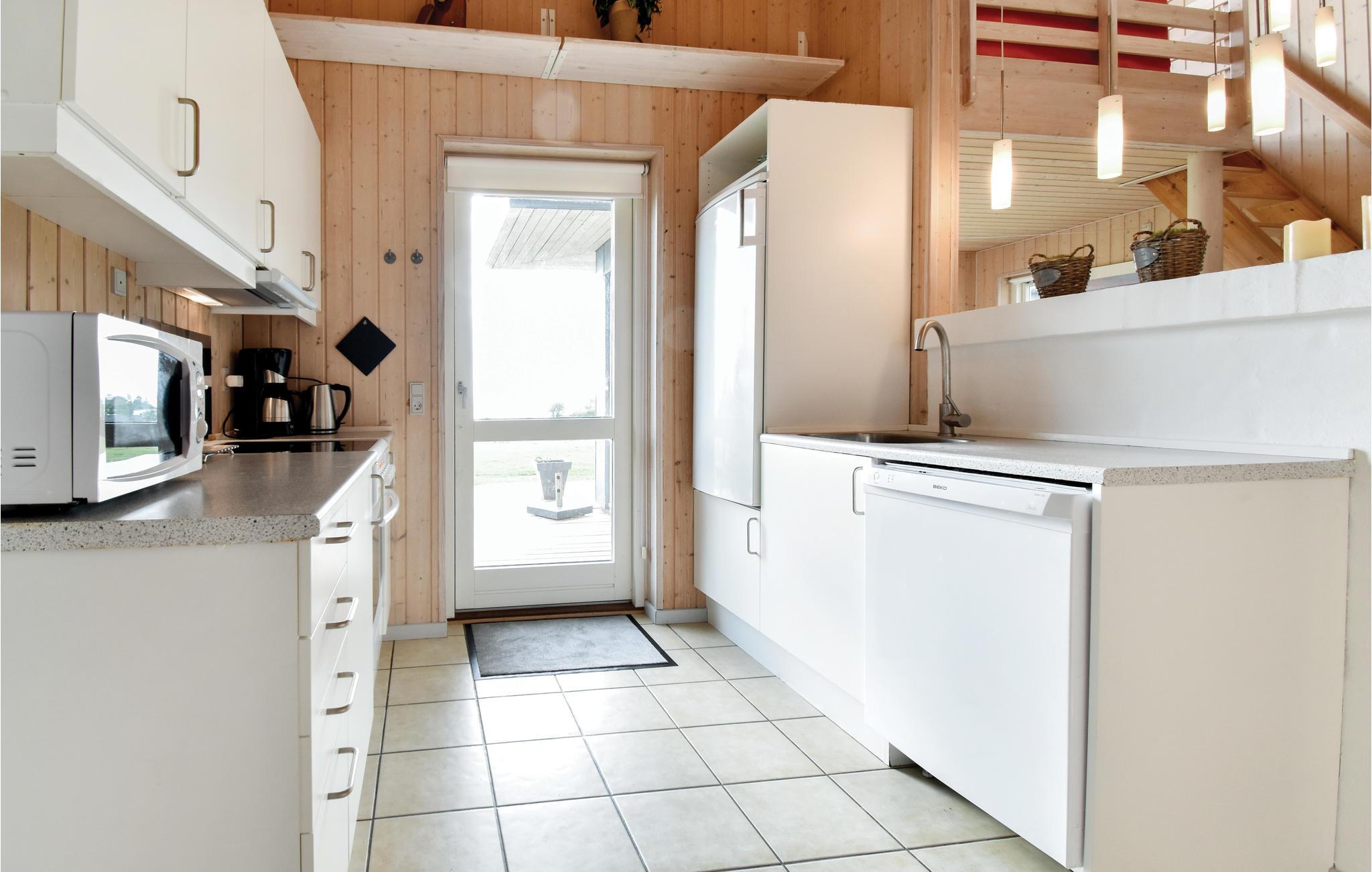 Huset ligger kun 300 m fra stranden og har en flot udsigt over havet. Centrum i huset er den store stue, der er kombineret med det åbne køkkenmiljø. Stuen er meget smagfuldt indrettet, og den frie og hyggelige stemning understreges hen under aften af ildens knitren i brændeovnen. Fra stuen er der adgang til en velafskærmet terrasse. I det pragtfulde, store badeværelse venter et 2-personers spabad, hvor I effektivt får masseret de ømme muskler. Fra badeværelset er der adgang til en tur i saunaen. Soveafdelingen består af fire lyse soveværelser tre med en dobbeltseng samt et med køjesenge med plads til to personer. Endvidere en hems og endnu et badeværelse. Husets indretning og rumfordeling gør det velegnet til to familier. Sommerhuset ligger placeret lige ved siden af områdets store og flotte legeplads, hvor I kan sidde på jeres egen terrasse og se de mindste gæster slå sig løs.