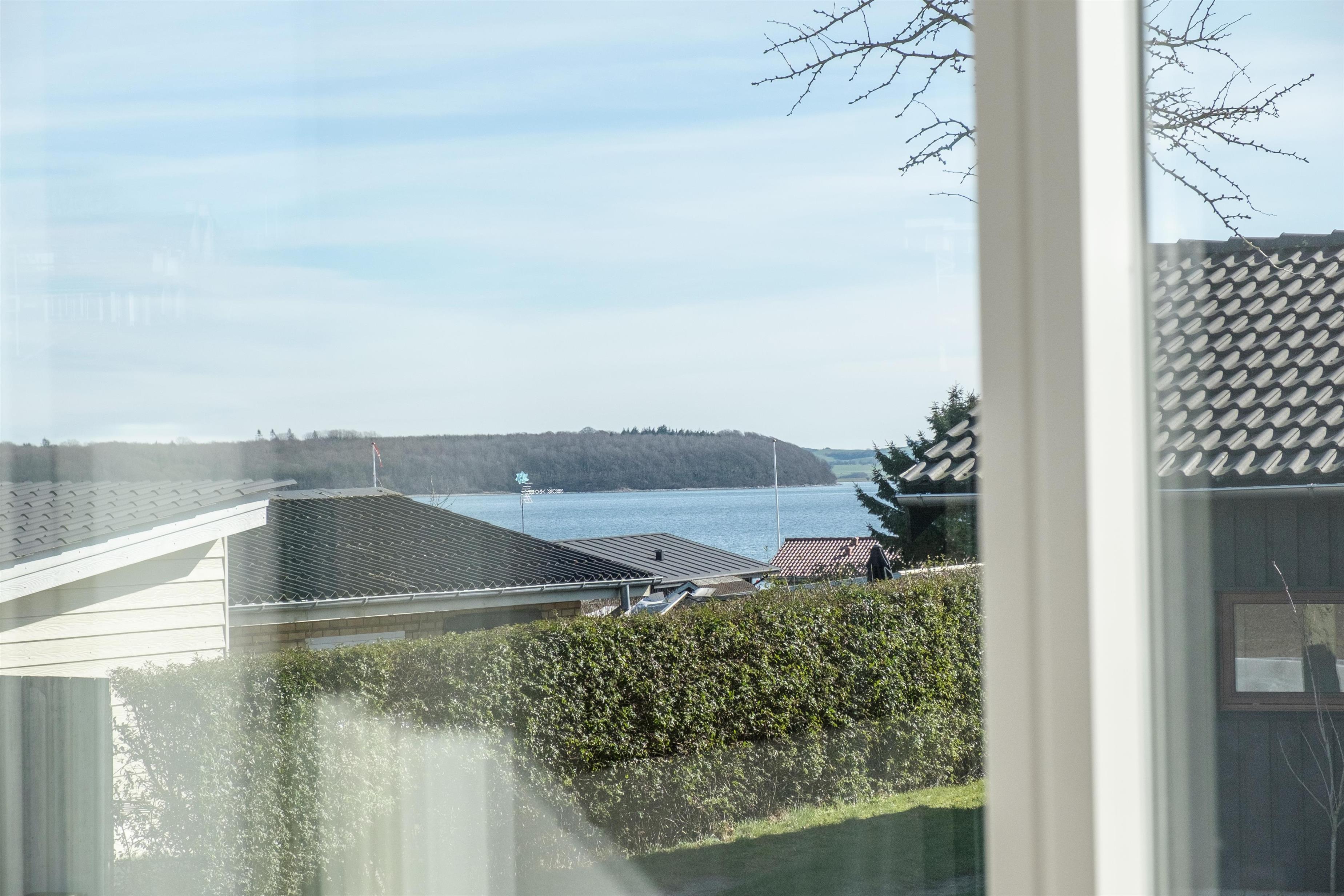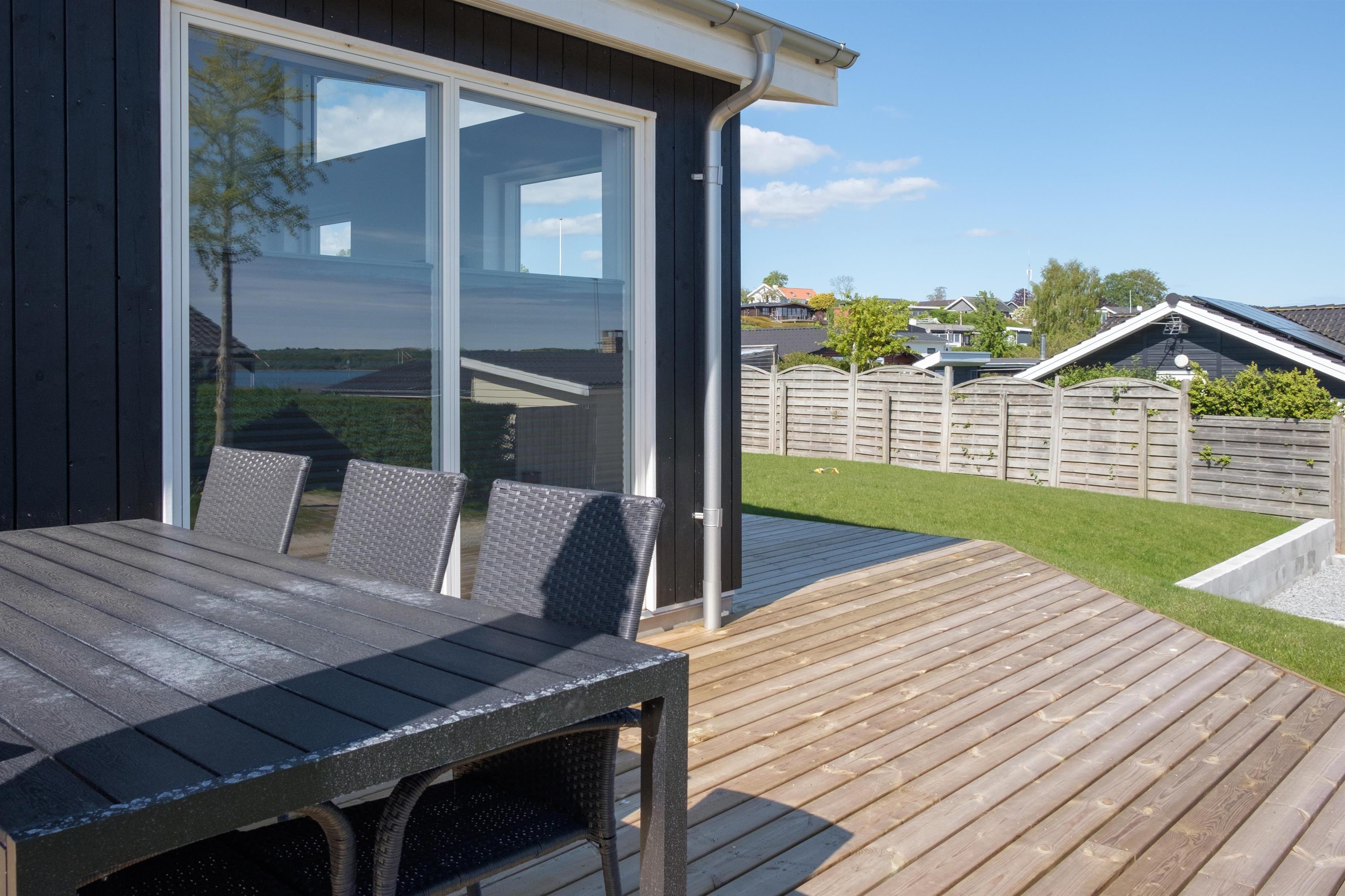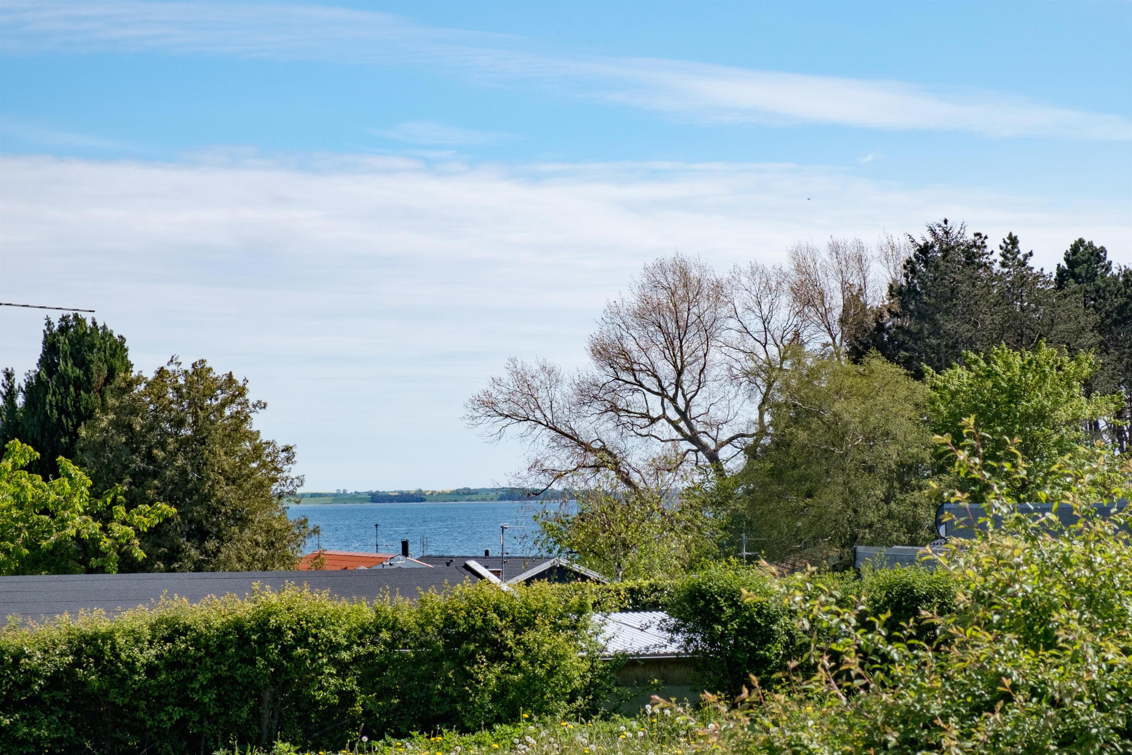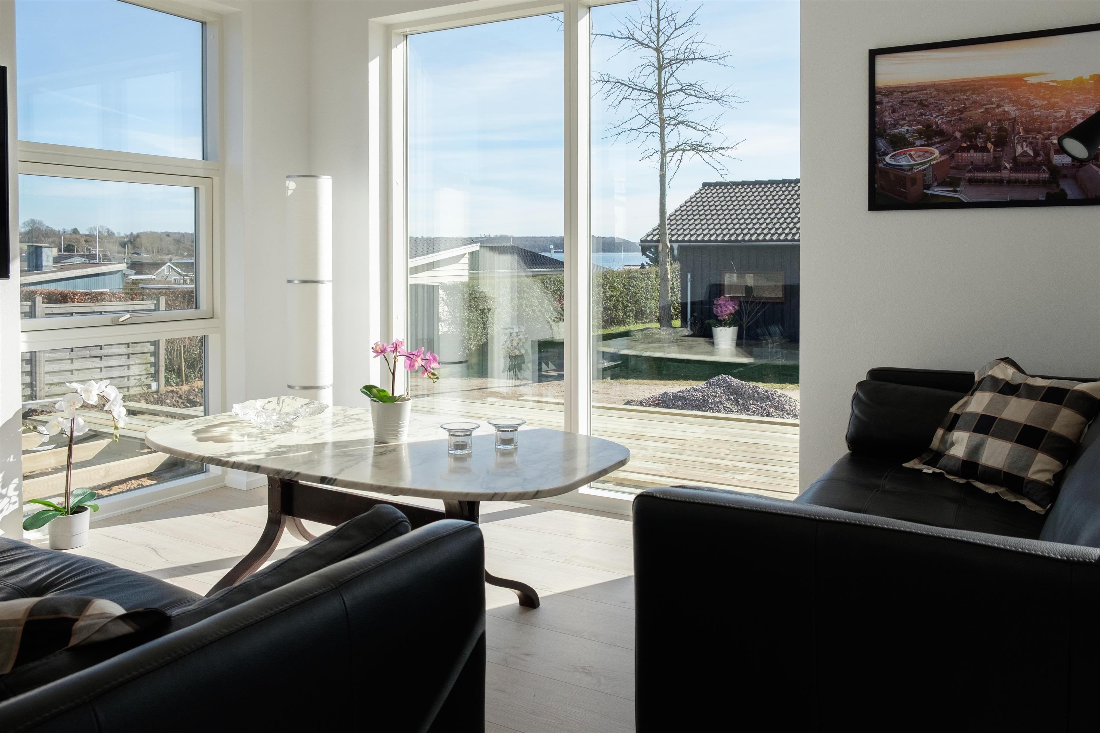 Nybygget feriehus med udsigt over Aarhus Bugt og tæt på Følle Strand, perfekt til en afslappende ferie i naturskønne omgivelser.