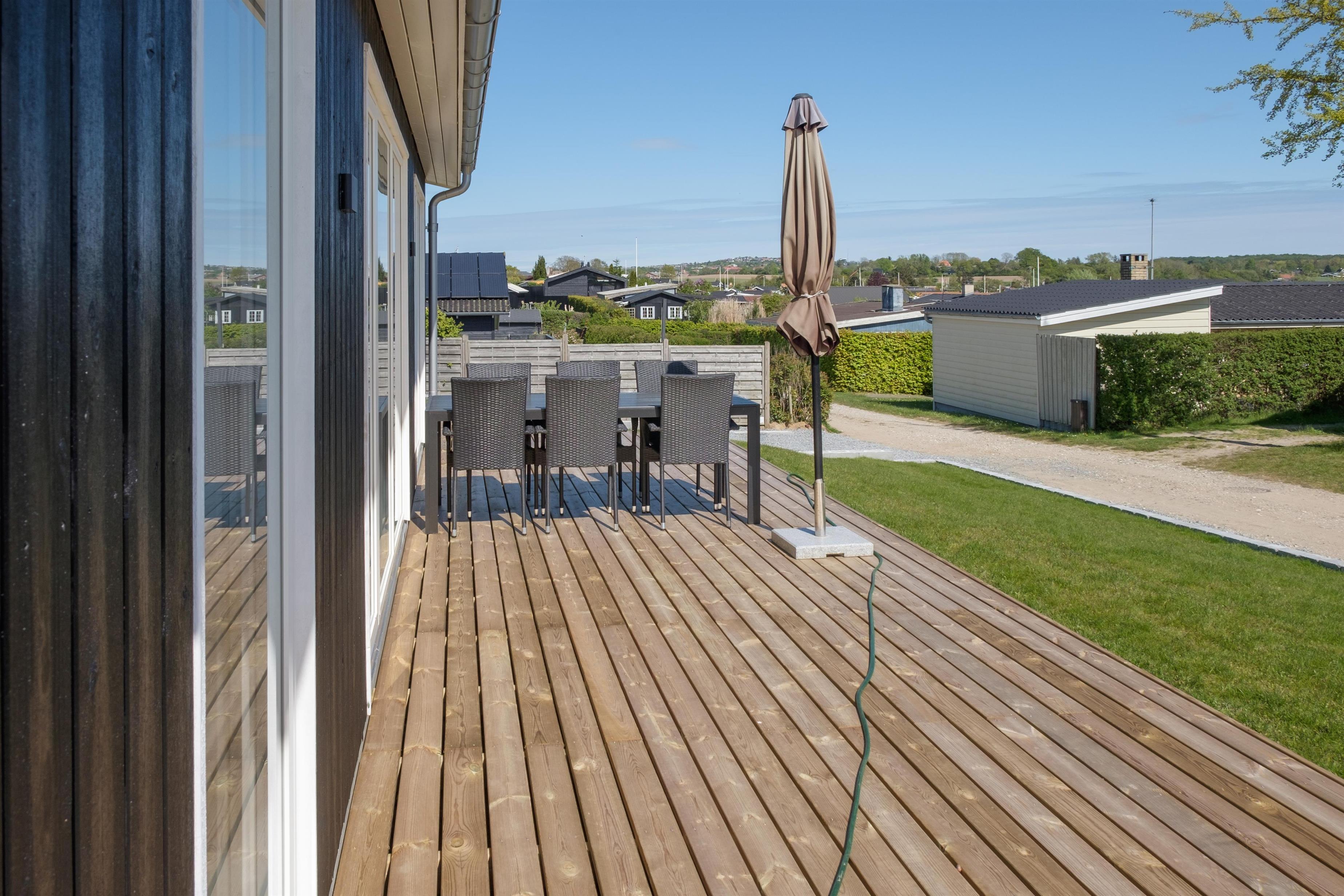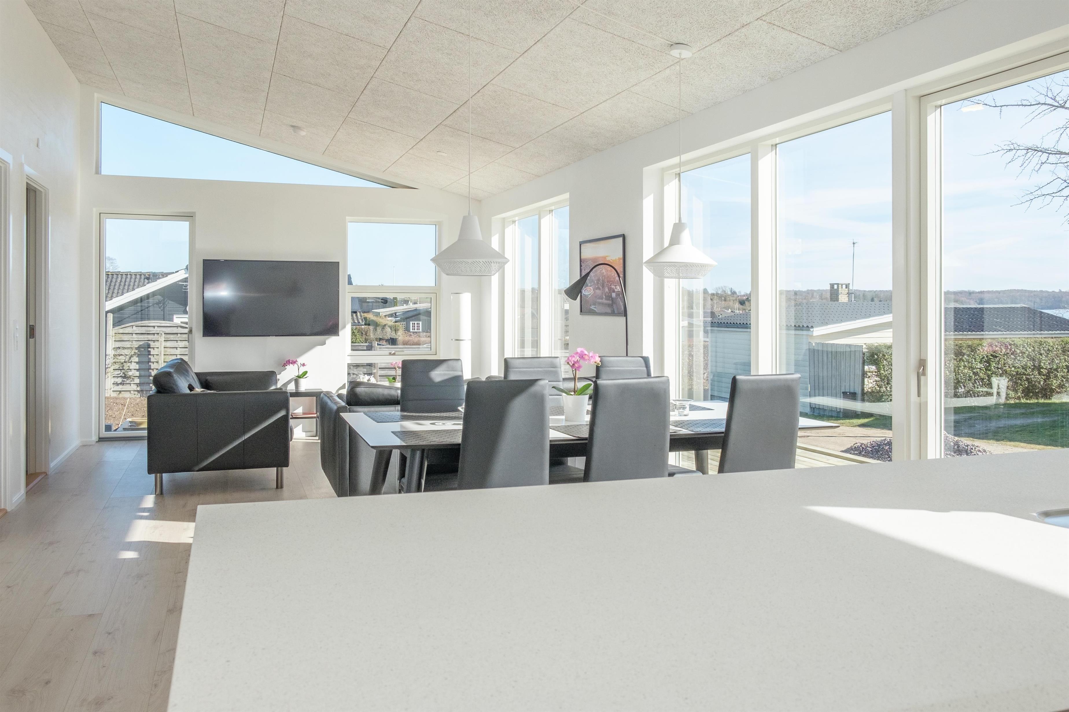 Dette helt nybyggede feriehus fra 2019 er højt beliggende på åben naturgrund ved Følle Strand med udsigt over Aarhus Bugten og bare 150 meter fra god badestrand. Et skønt, lyst og gennemført indrettet hus. Huset er omgivet af stor træterrasse med gode havemøbler, liggestole, parasol og grill, hvor man kan nyde solen i både dag- og aftentimerne.