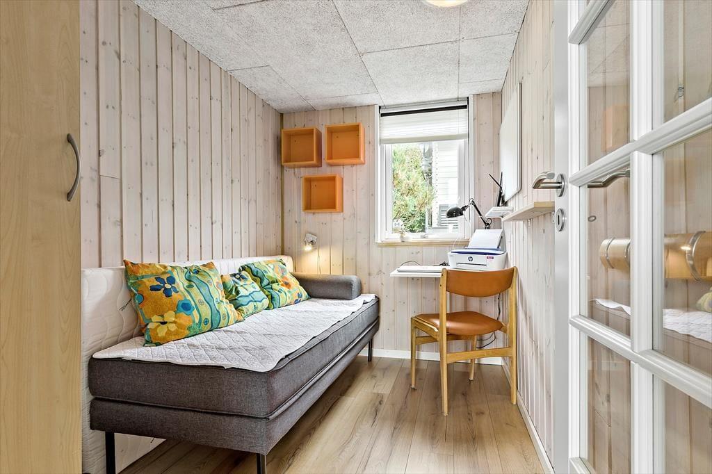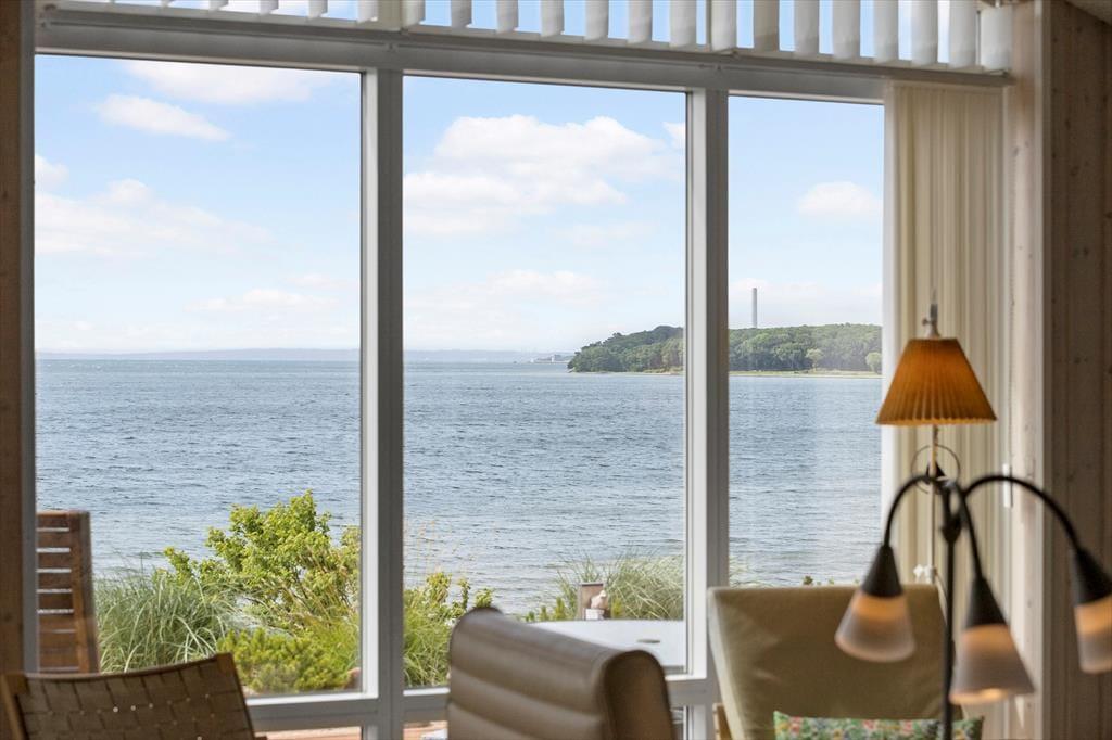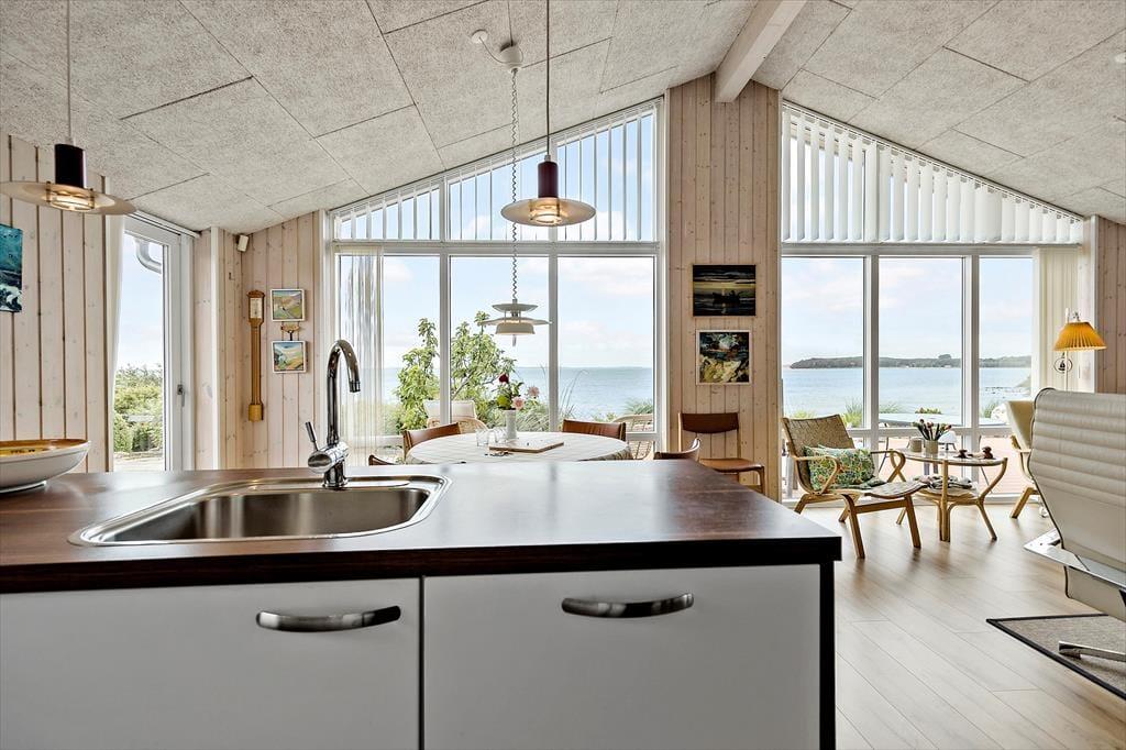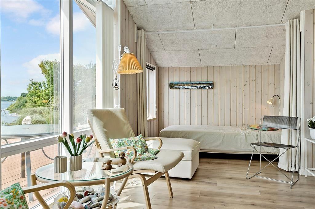 Dette fantastiske hus ligger højt og det gør at den fulde udsigt over Løgten bugt med det blå – blå hav kommer helt ind i stuen. Der er 2 værelser og en alkove til den mindre familie, eller parret som bare vil nyde den smukke natur helt tæt på og i fred og ro. Køkkenet er en del af stuen så også herfra kan man stå og lave mad og nyde udsigten.