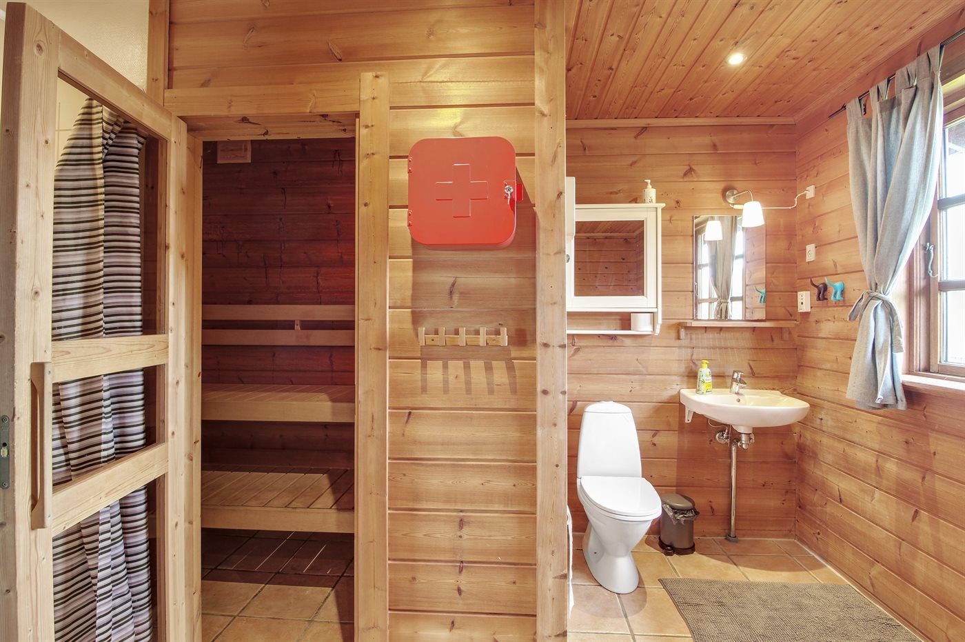 Der er 1 badeværelse med bruser og 2 toiletter, heraf 1 gæstetoilet. Der er gulvvarme på 1 badeværelse. I saunaen er der mulighed for afslapning.
