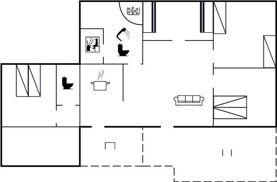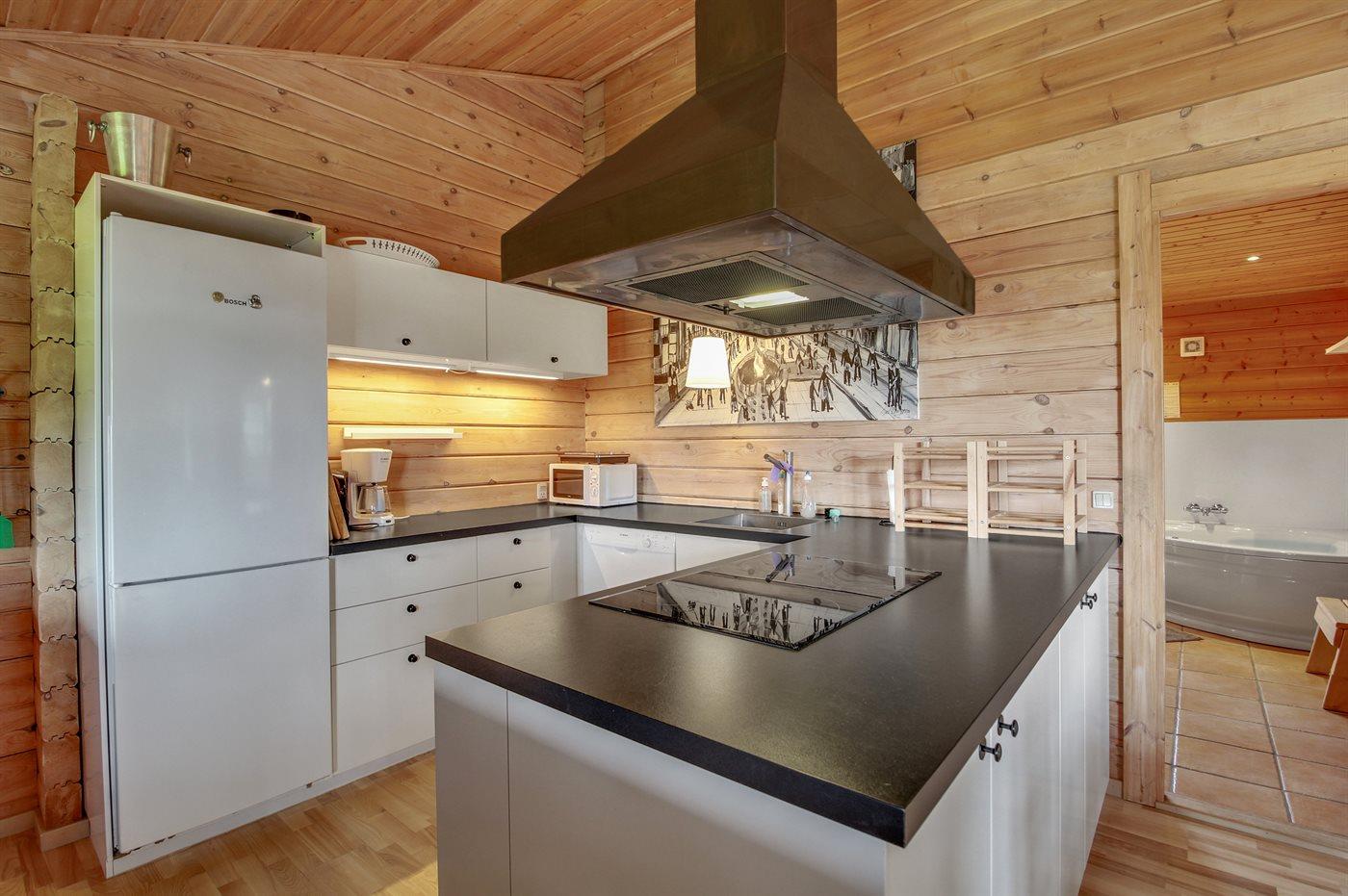 Køkkenet er udstyret med 1 køleskab. Der er 4 induktionskogeplader, varmluftovn, mikrobølgeovn samt opvaskemaskine.