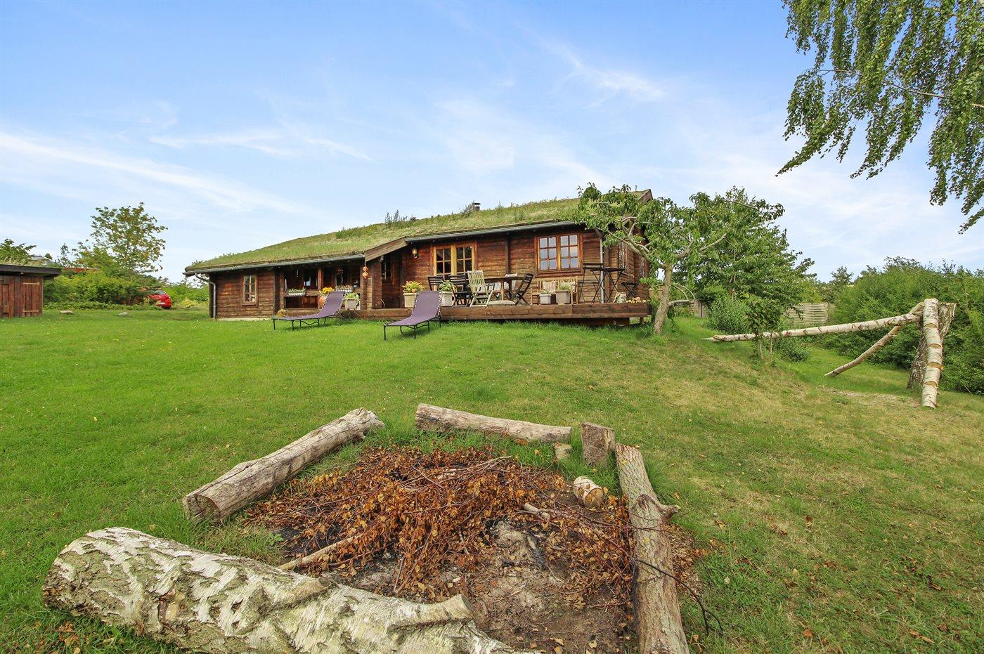 Sommerhus beliggende med udsigt til vandet i udkanten af et sommerhusområde nær børnevenlig badestrand.