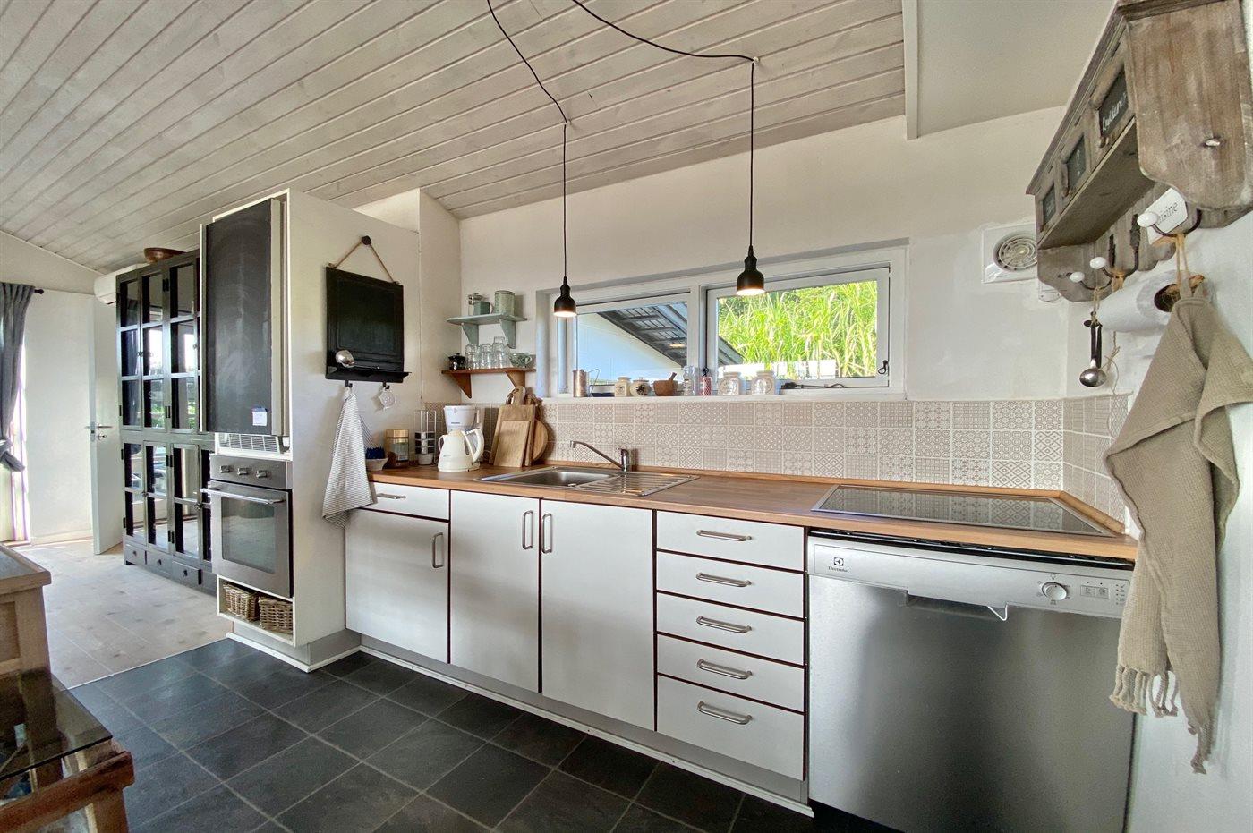 Køkkenet er udstyret med 1 køleskab. Der er 4 keramiske kogeplader, varmluftovn samt opvaskemaskine.