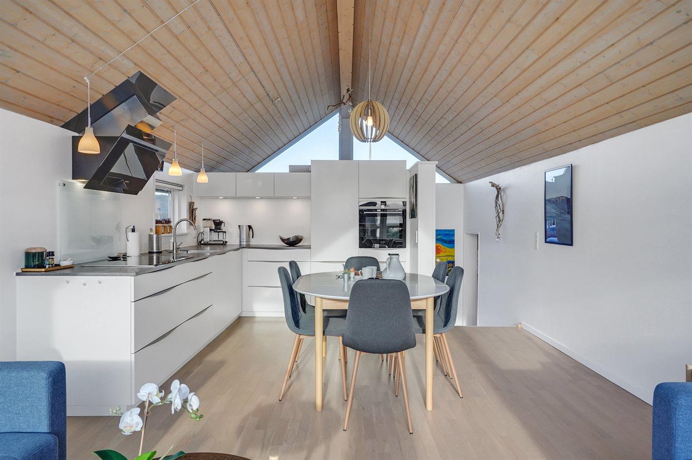 Køkkenet er udstyret med 1 køleskab. Der er 4 induktionskogeplader, varmluftovn samt opvaskemaskine.