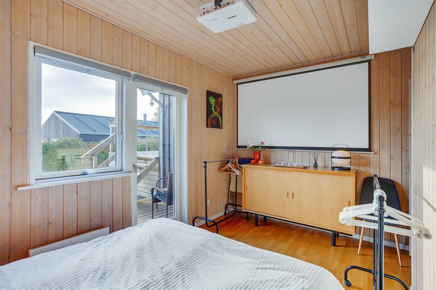Der er ikke TV i ferieboligen. Der findes dog en projektor samt lærred og der er installeret chromecast.1 Bluetooth-højtaler (Sonos). Der er trådløst internet til rådighed.