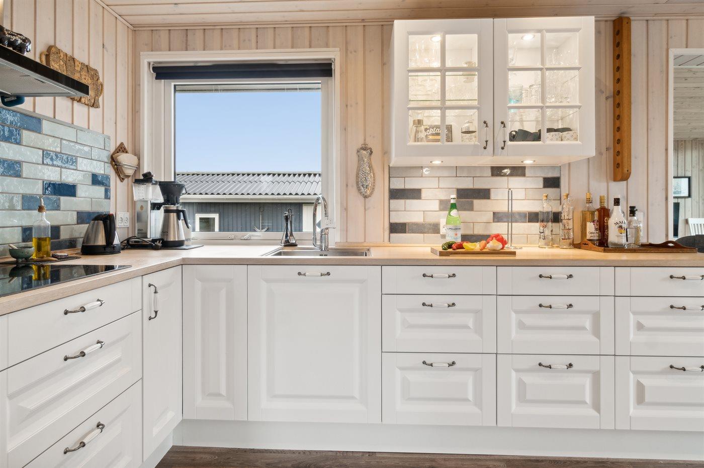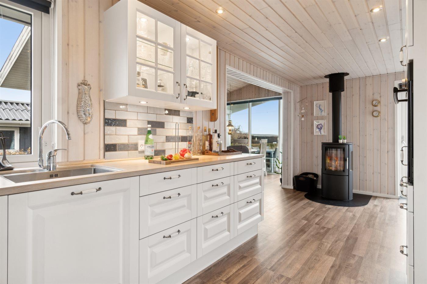 Køkkenet er udstyret med 1 køleskab. Der er 4 keramiske kogeplader, varmluftovn samt opvaskemaskine.