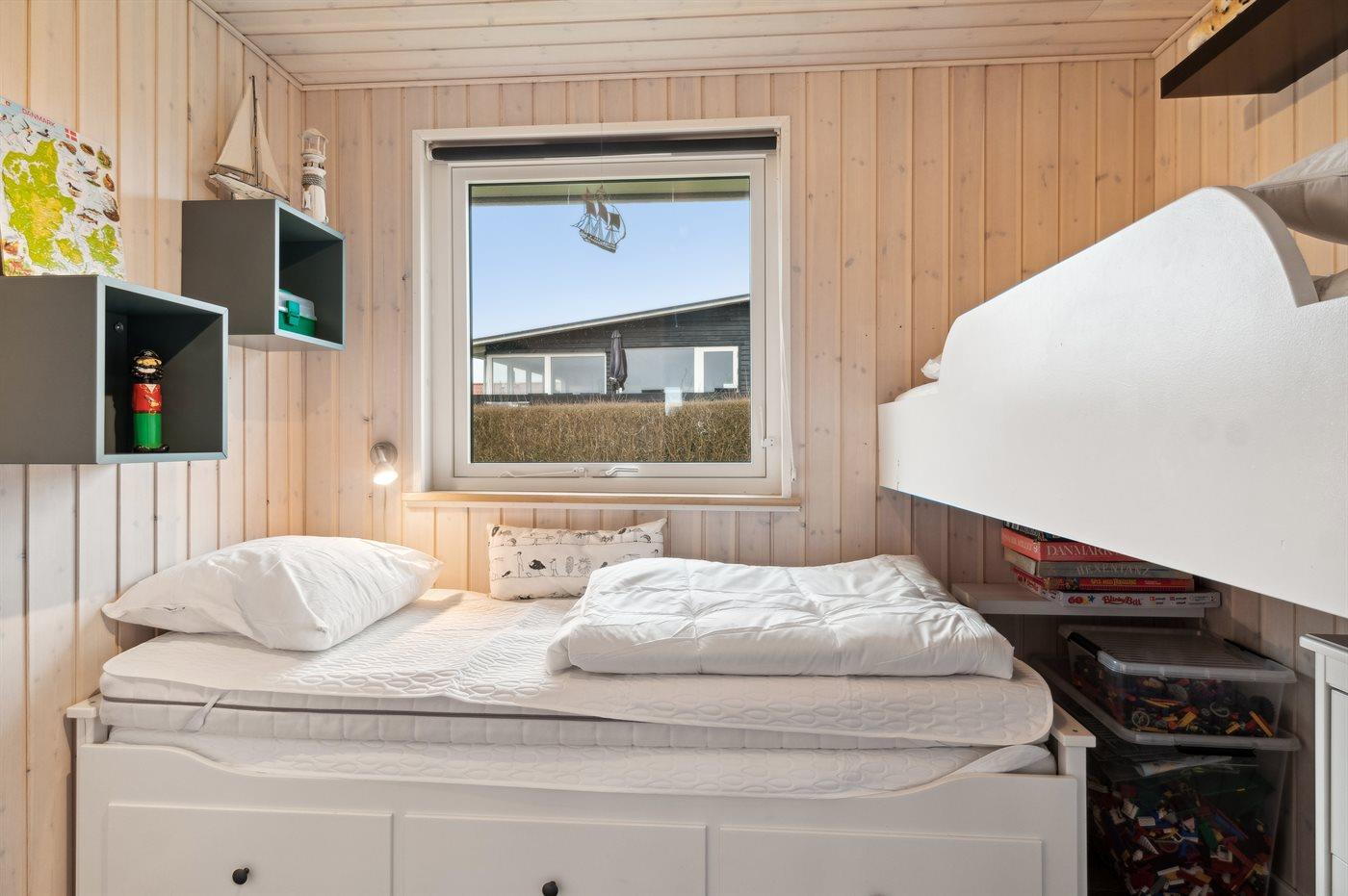 Der er i alt 2 soveværelser. Sovepladserne fordeler sig på: 2 sovepladser i dobbeltseng. 2 sovepladser i enkeltsenge.1 soveplads i køjeseng.