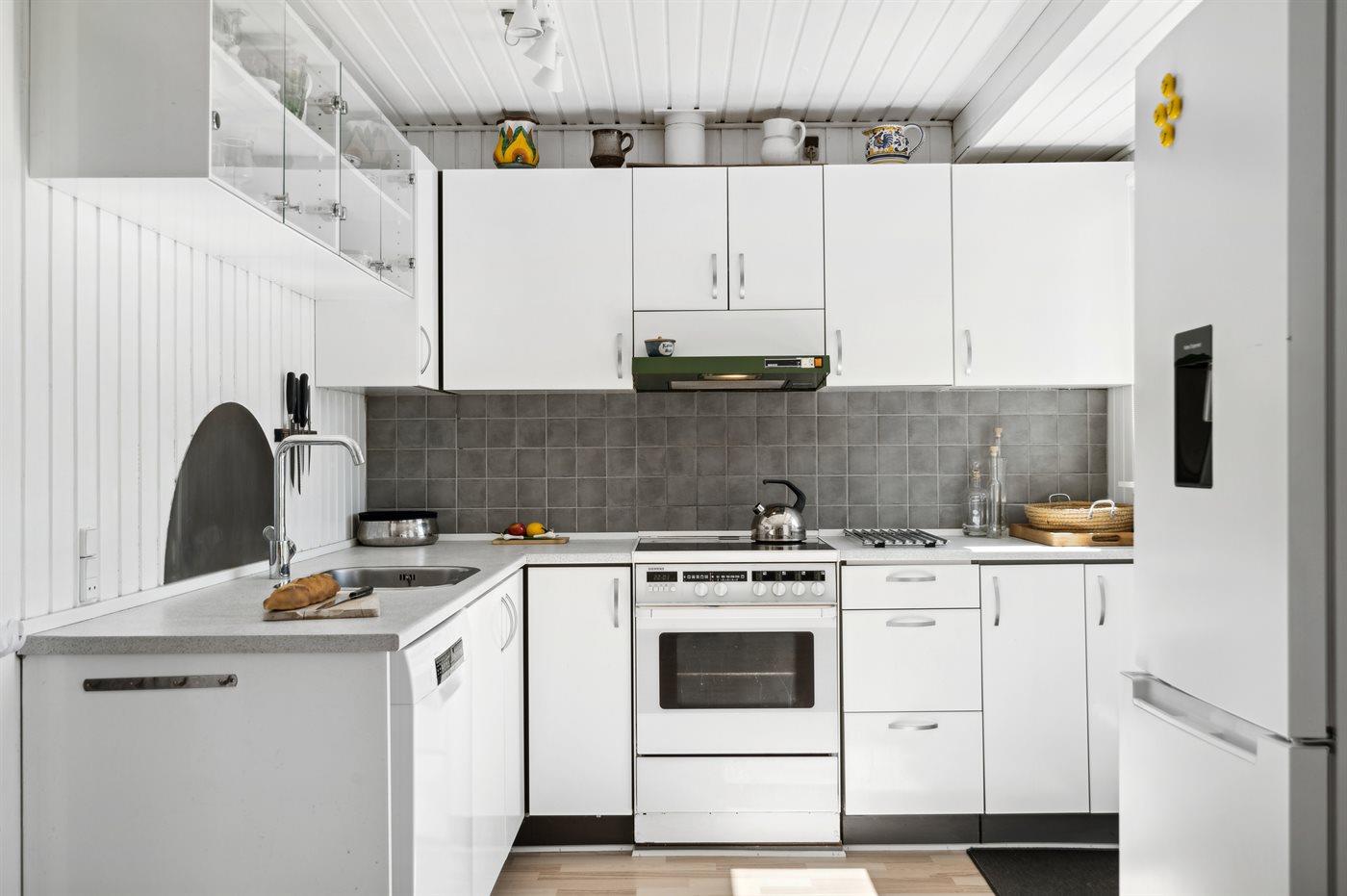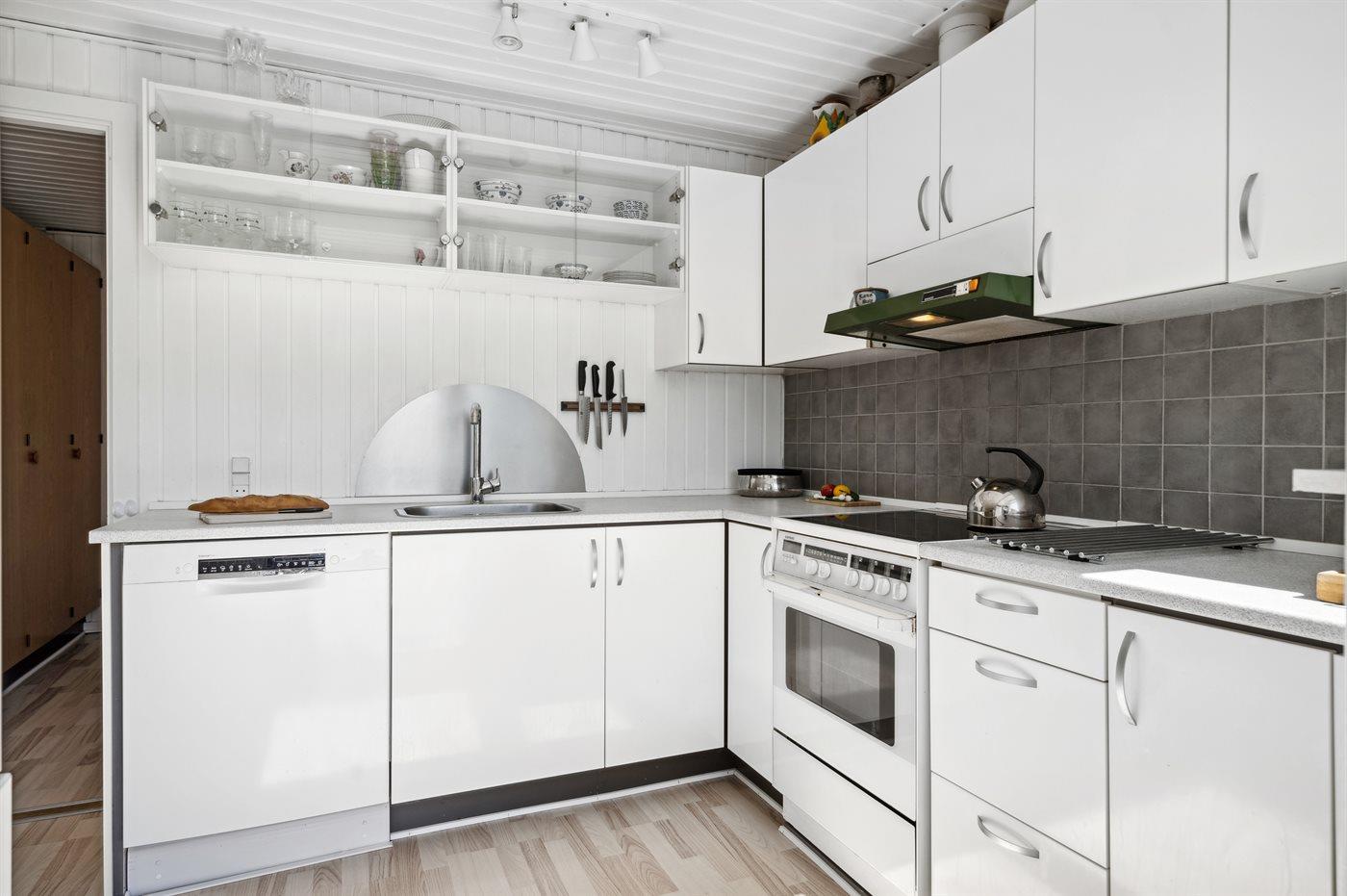 Køkkenet er udstyret med 1 køleskab. Der er 4 keramiske kogeplader, varmluftovn samt opvaskemaskine.